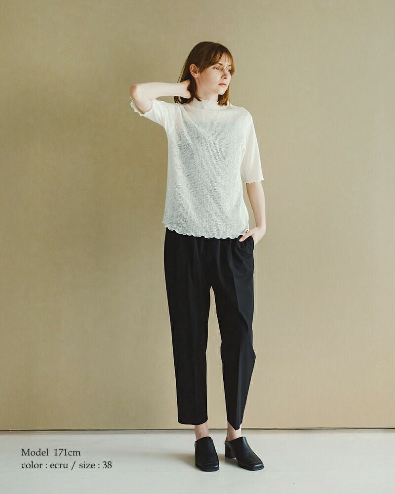 身頃から自然に立ち上げたモックネックが、首元を優しく、そしてスマートに演出。顔回りに華やかさを添えるため、ジャケットやカーディガンのインナーとしても最適です。