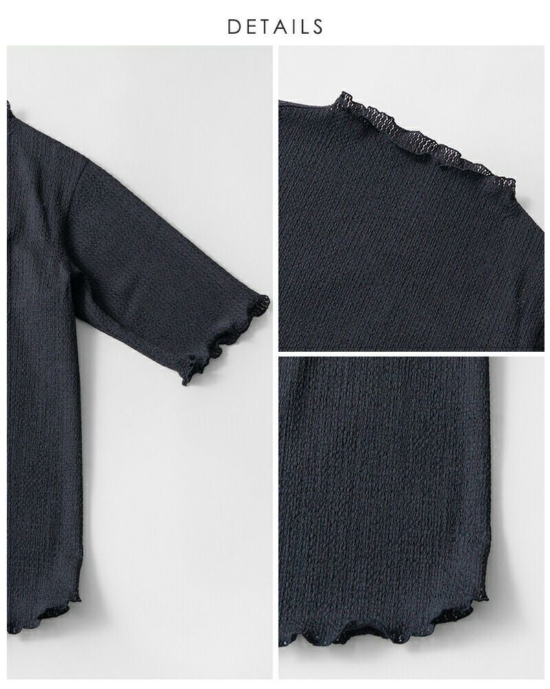 ネックラインや袖口、裾にはメロウ加工を施し、ひらひらとした波打つような動きが女性らしさを引き立てます。