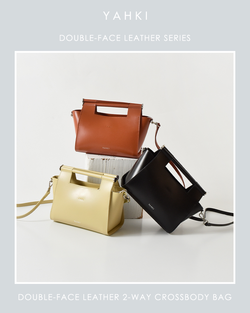 YAHKI(ヤーキ)よりダブルフェイスレザー クロスボディバッグのご紹介です。ミニマルなフォルムに、洗練された存在感を宿すYAHKIらしいデザインのボディバッグ。素材には床革(牛革)を使用。表面に加工を施すことで、発色の美しさと撥水性、耐久性を兼ね備えています。程よくハリのある質感で、型崩れしにくく、デイリーに扱いやすいのも魅力です。無駄を削ぎ落としたミニマルなフォルムが、スタイリングを選ばず上品に寄り添う一品。フラップデザインが程よい存在感を放ち、シンプルながらも洗練された印象に仕上がっています。コンパクトながらマチをしっかり確保し、必要な荷物をスマートに収納可能。シンプルなコーディネートに合わせるだけで、洗練された印象をプラスしてくれるバッグです。