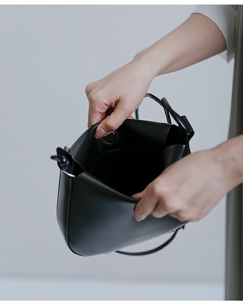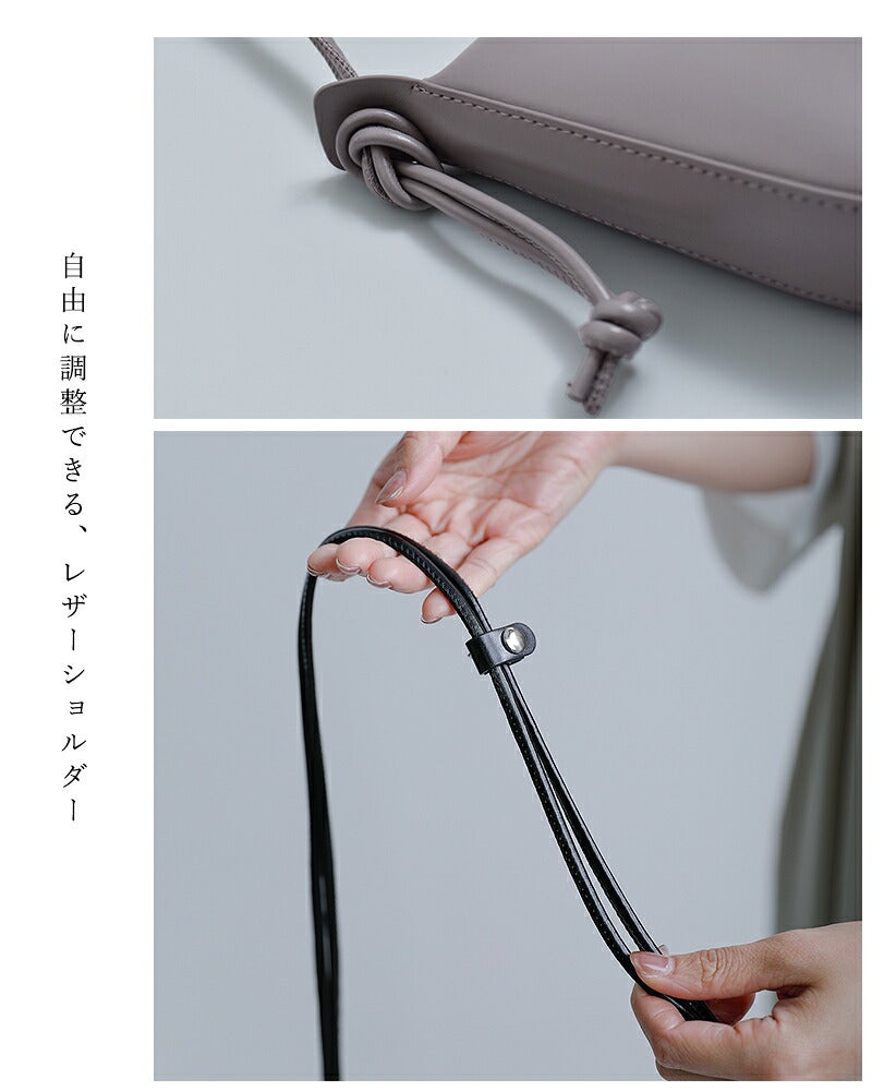 すっと伸びる細身のストラップと、無駄のないフォルム。 手に持ったときも肩に掛けたときも、すっきりとしたバランスで装いに馴染みます。結び目の位置を変えることで印象がさりげなく変化し、スタイリングに合わせたアレンジも可能。軽やかに持てる、洗練された佇まいが魅力です。