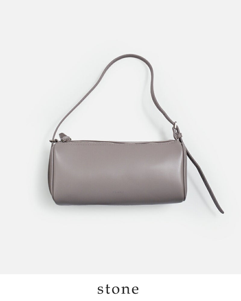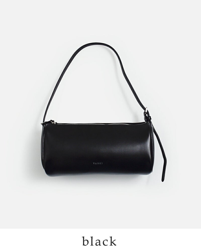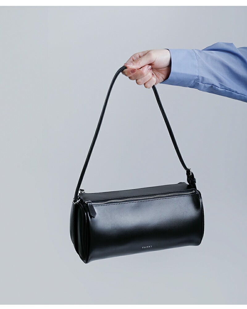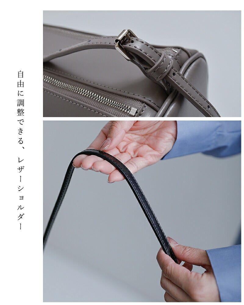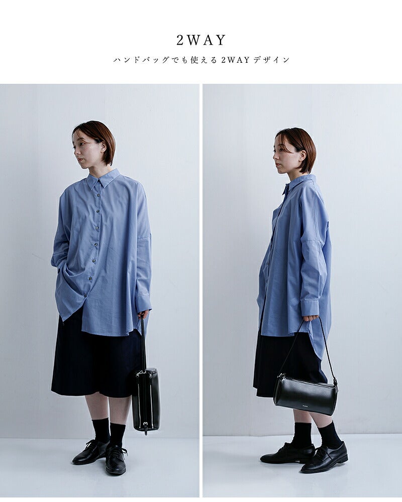 筒形シルエットは見た目以上に容量があり、長財布やスマートフォン、ポーチなどの必需品がきれいに収まるサイズ感。間口はファスナー仕様で大きく開き、中身が見やすく出し入れもスムーズです。シンプルで無駄のない佇まいがどんな装いにも自然に寄り添い、デイリーに活躍するショルダーバッグです。