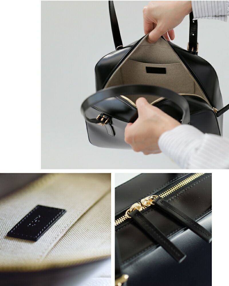 レザーハンドルも、ゴールドメタルバックルで長さ調節が可能。手提げ、または肩掛けが可能です