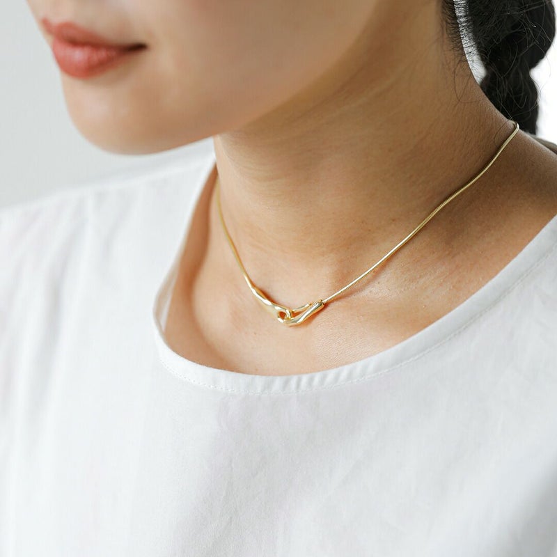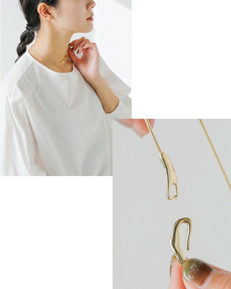 フックを片方の穴に通して付けるミニマルなネックレス。シンプルだけれどもモード感がありつつ、毎日付けても飽きのこないバランスを意識してデザインしてます。