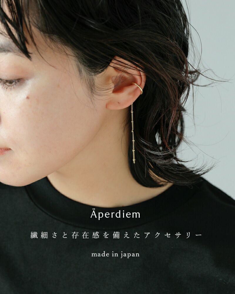 Aperdiem(アペルディエム)より、スターリーラウンドイヤーカフ“Starry Round Ear Cuff”のご紹介です。デザインチェーンが揺れ動く、可憐な印象のイヤーカフ。ピアスホールがない方にも着用していただけます。小ぶりで華奢なデザインで、合わせやすいのも◎。光沢のある肌馴染みの良いゴールドがクールさを演出し、こなれた印象に仕上げてくれます。大人の女性のための繊細で美しいアクセサリー。※片耳のみとなります。