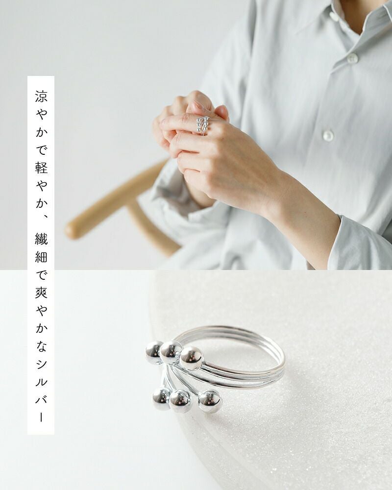 ボールを支える本体はシルバーのコードが三重になったユニークな構造。一本一本がそれぞれのボールに取り付き、カーブを微妙に変えながらバランス良くまとめられています。シルバー925素材なのでじんわり力を加えて指のサイズにフィットさせることができ、お好みの指での着用が可能です。