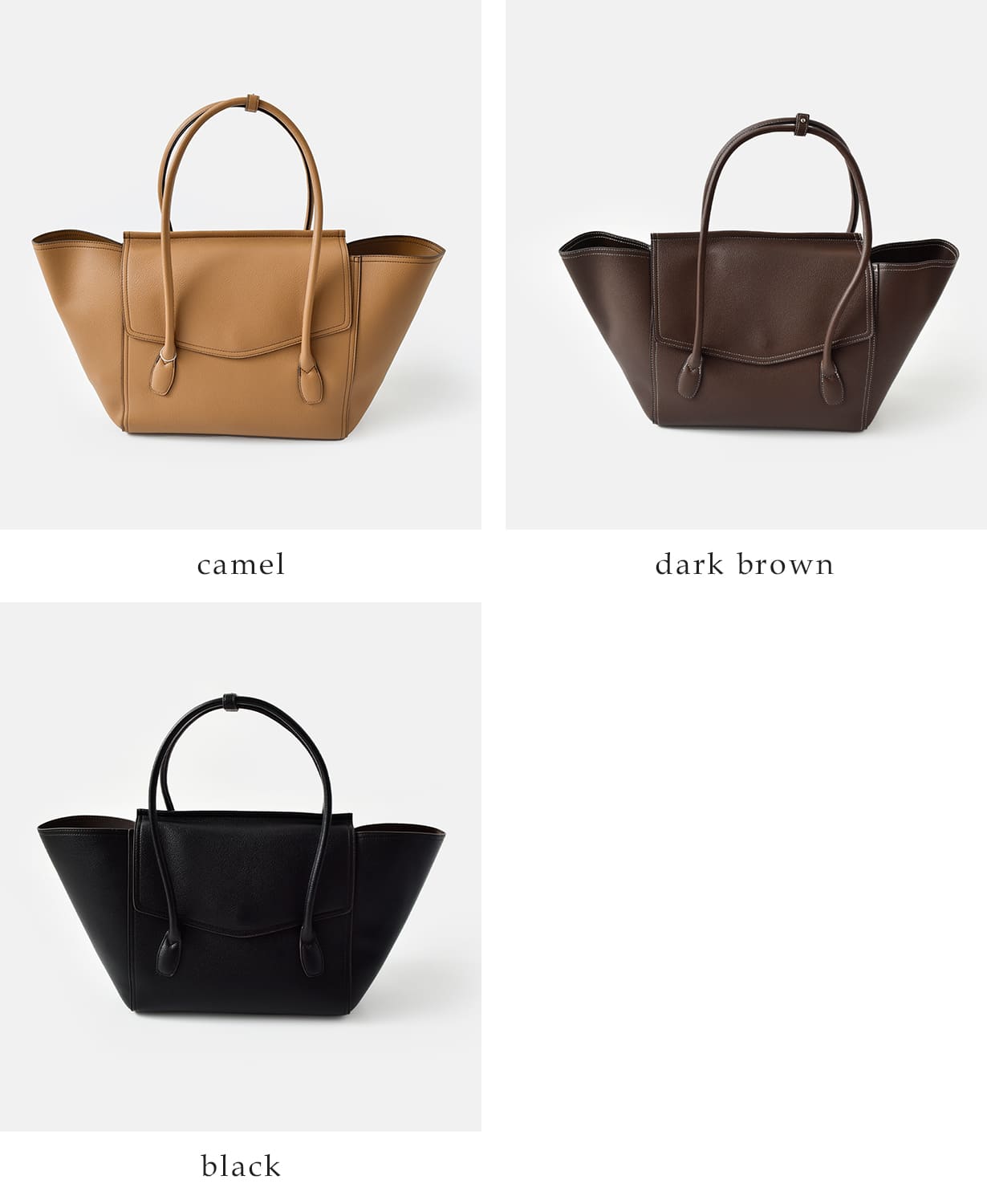 底に近い部分からデザインされたハンドルが印象的なA4対応トート。肩掛けにも対応する便利な長さで、マチ付きの収納力に加え、小物を整理できる内ポケットを備えています。中身を隠すフラップはマグネット開閉で開け閉めもスムーズ。上品なシボ感のフェイクレザーは軽量ながら柔らかく、きれいめからカジュアルまでオンオフ問わずコーディネートを引き立てます。底マチ四隅の金具が自立をサポートし、持ち手はボタンストラップでまとめられる実用性も魅力です。