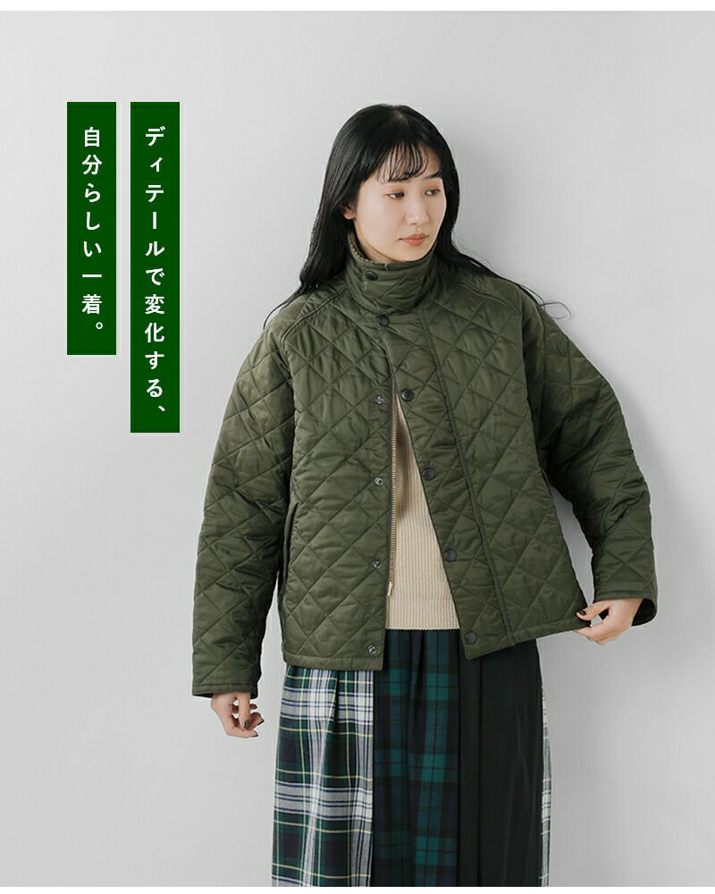 表地には軽量で耐久性に優れたナイロン素材を使用。風や軽い雨を防ぎつつ、動きやすさも確保しています。内側は中綿入りのダイヤキルティング仕様で、保温性を高めながらもすっきりとしたシルエットを実現。