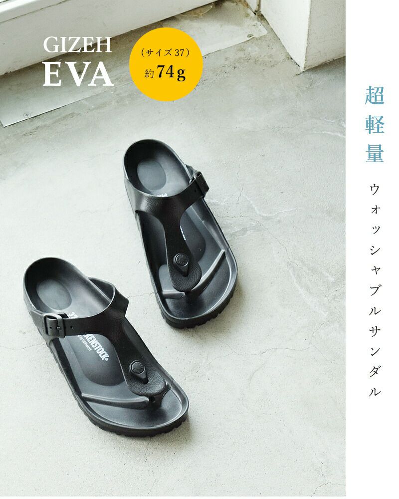 BIRKENSTOCK(ビルケンシュトック)より、ギゼ EVA レギュラー トング サンダル “Gizeh EVA” gizeh-evaのご紹介です。 ビルケンシュトックの定番コルクサンダル gizeh-eva/ギゼをモデルとしたこの商品には、EVA素材が使用されています。EVAは、耐久耐水性に優れていて、濡れた場所でも滑りにくいことが特徴です。また、汚れても水洗いできるのでお手入れも簡単です。お肌に優しいこの超軽量ソールが、ビルケンシュトックならではの快適な履き心地をお約束します。