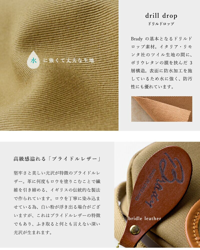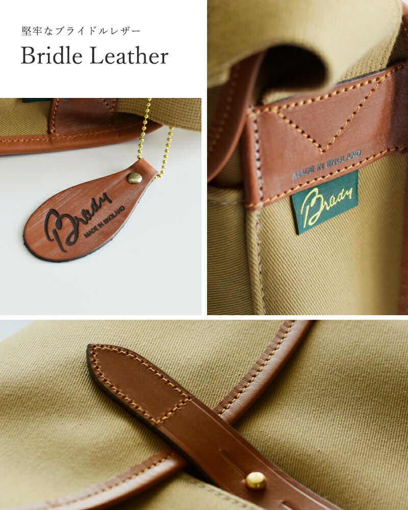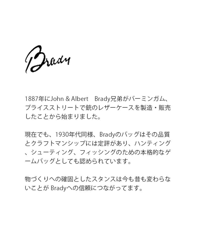1887年にイングランドで設立されたBrady。フィールドスポーツのための皮革製品から始まり、その品質の良さから公爵を含めセレブや皇族に高く評価され、またその時代を代表する一流俳優にも愛され、あっという間にアメリカで広まっていきました。そののち、馬具の会社と統合し現在では、ハンティングやシューティング、フィッシングのための本格的なゲームバッグとしても認められている。革やキャンバス、ハリスツイードなど最高の素材とともに、すべての製品はイギリスの自社工場で手作業で作られており、物づくりへの確固としたスタンスは今も昔も変わらないことがBradyへの信頼につながっている。