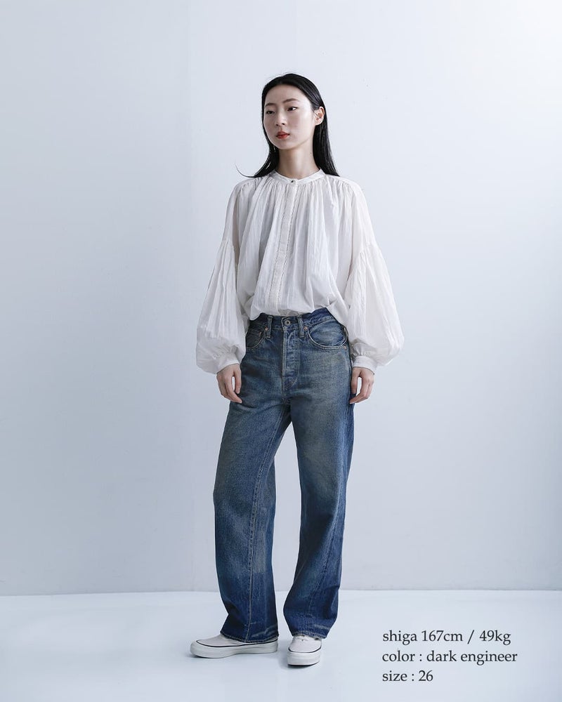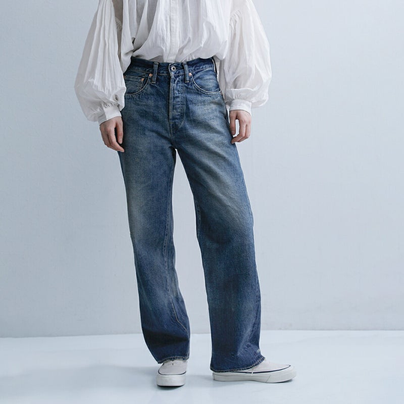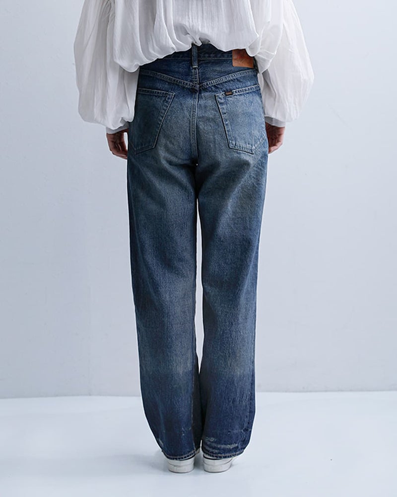 ウエストはボタンフライ仕様により、前面がスッキリとしてシルエットを美しく保ちます。使い込まれたようなヴィンテージ感漂うボタンが印象的です。