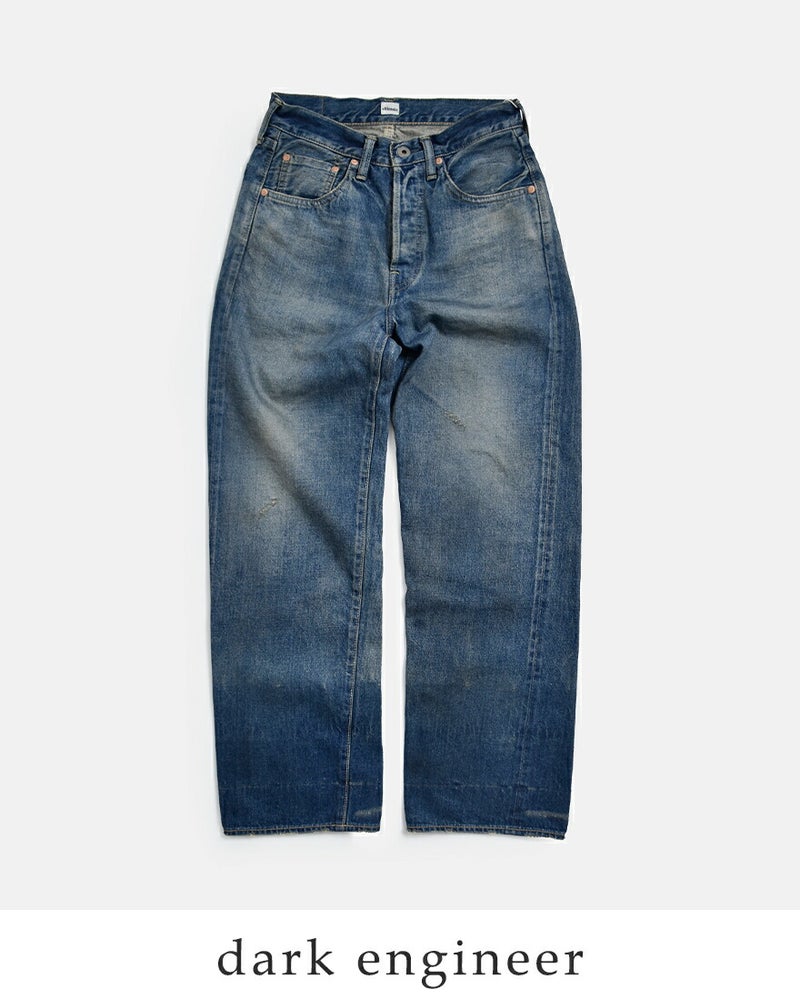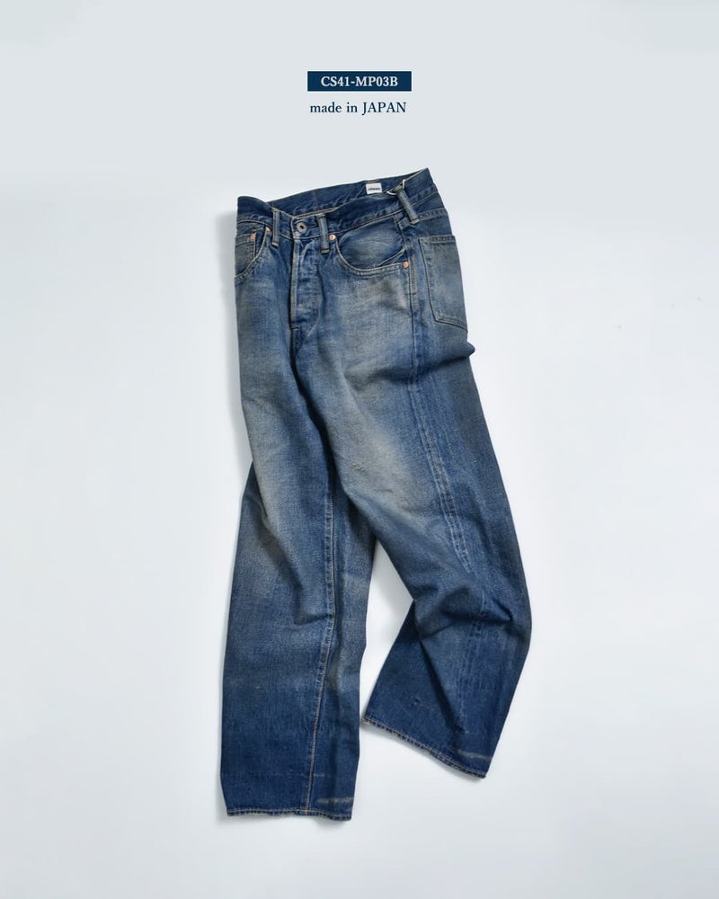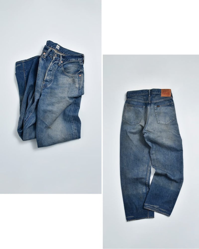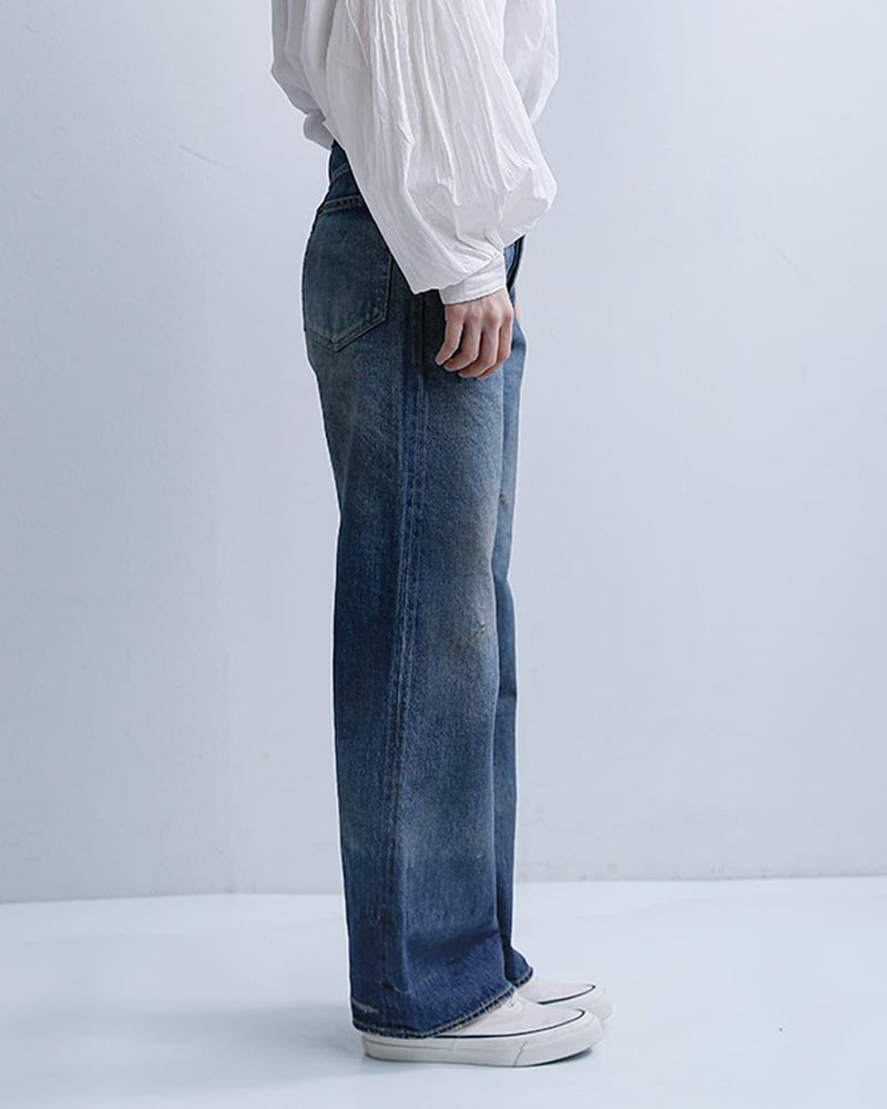 生地には13.5ozのセルビッチデニムを使用しており、薄すぎず厚すぎない程よい厚さが特徴です。程よいハリ感がありながら、穿き込むことで生地が体に馴染み、しっくりとした風合いに育ちます。各所に施された汚れや傷も、デニムに独特の個性をプラスしています。