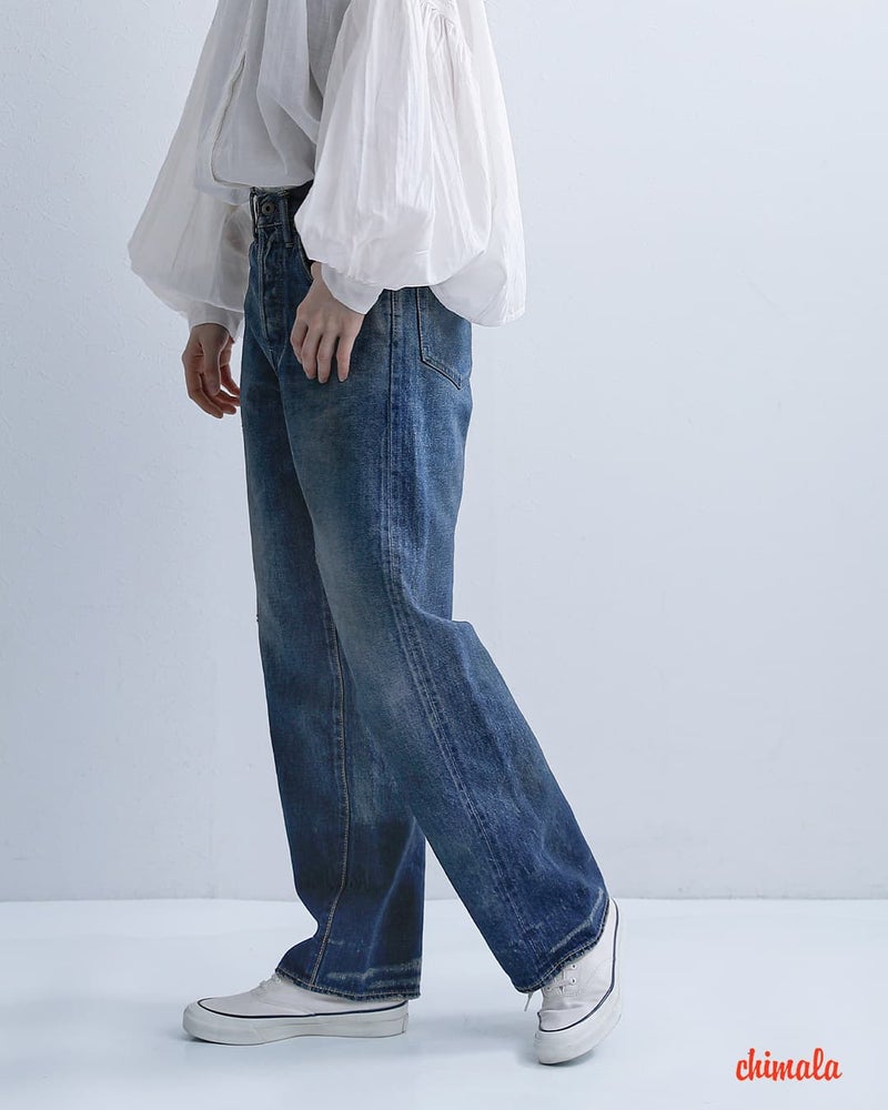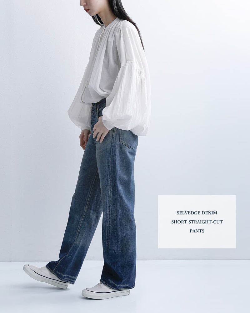 chimala(チマラ)より、セルビッチデニムショートストレートカットパンツのご紹介です。ヴィンテージのような風合いと、丁寧な加工感が魅力のデニムパンツ。13.5ozのセルビッチデニムを使用し、履き始めから柔らかく馴染みの良い生地感に仕上げられています。自然な色落ちやダメージ加工など、長年履き込んだようなリアルな表情もこのデニムの魅力。日常のスタイリングに取り入れるだけで、こなれた雰囲気を演出してくれるデニムパンツです。