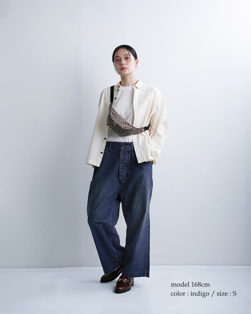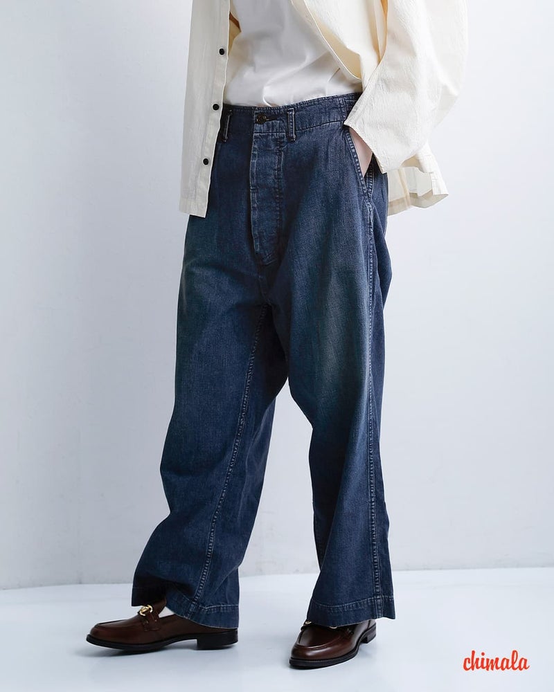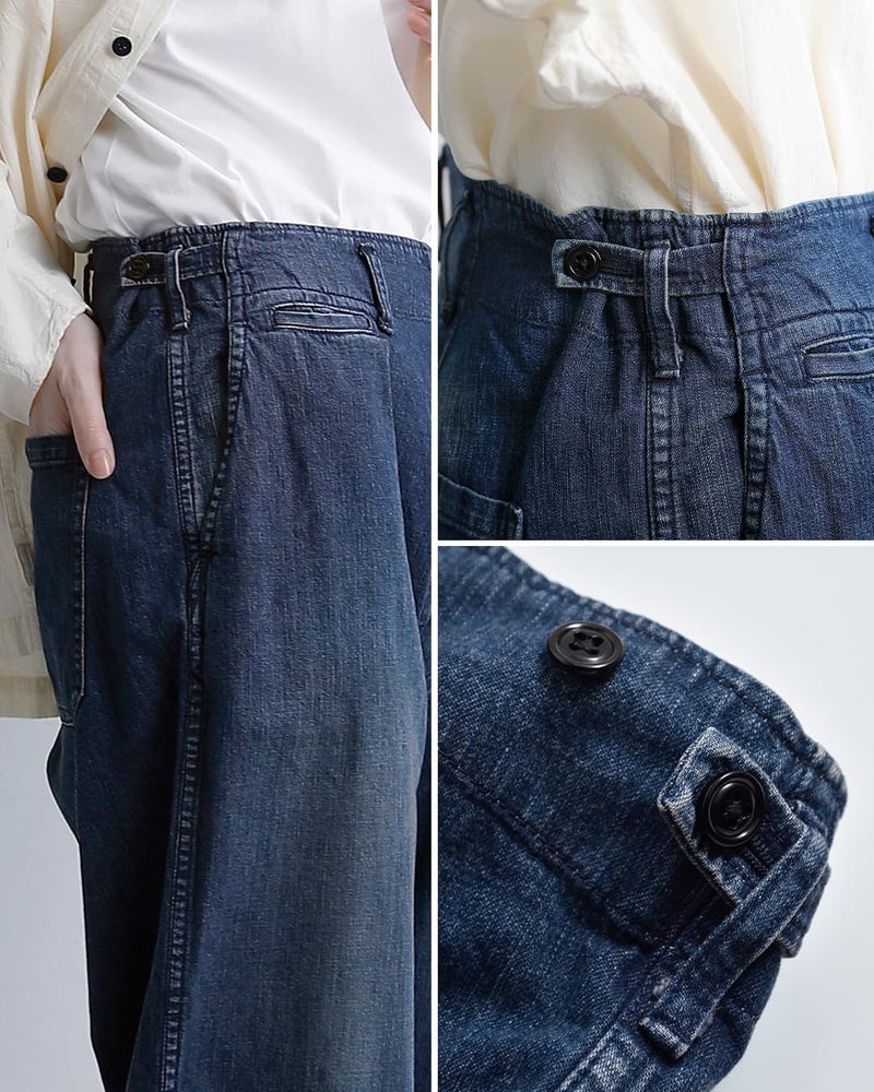 chimala(チマラ)より、USネイビーデニムショートトラウザーパンツのご紹介です。9.5OZのやや薄めのデニムパンツです。一般的な12~14オンスのデニムより軽く、ライトオンスに分類される適度な厚みの生地なので、真夏でも快適に穿ける軽さと、デニムらしい表情を両立したバランスの良さが特徴です。ストンと落ち感のあるシルエット。腰の左右にアジャスターがあり、調節できます。オールシーズン使える、日常使いにぴったりな一枚です。
