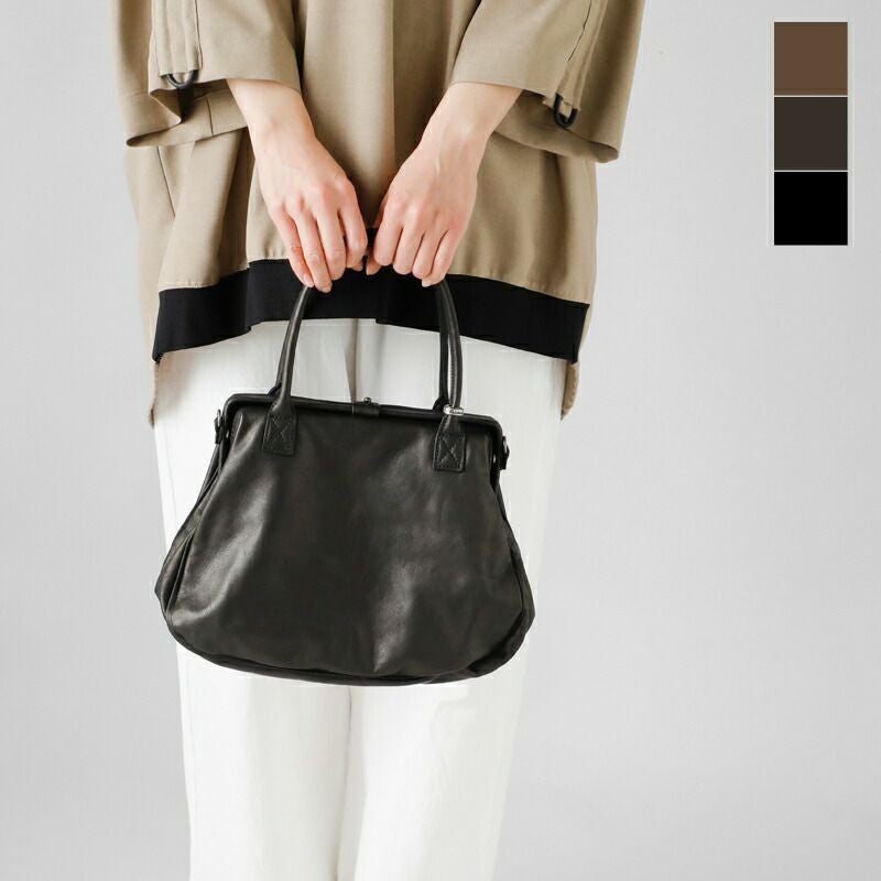 がま口がどこかレトロで愛嬌を感じるデザイン。ハンドルにはブランドロゴが刻まれたピューターリング付きです。