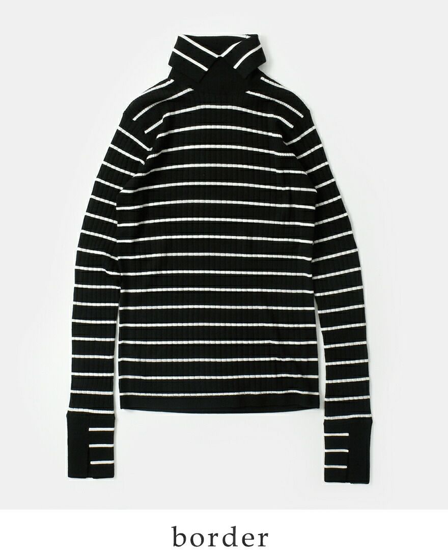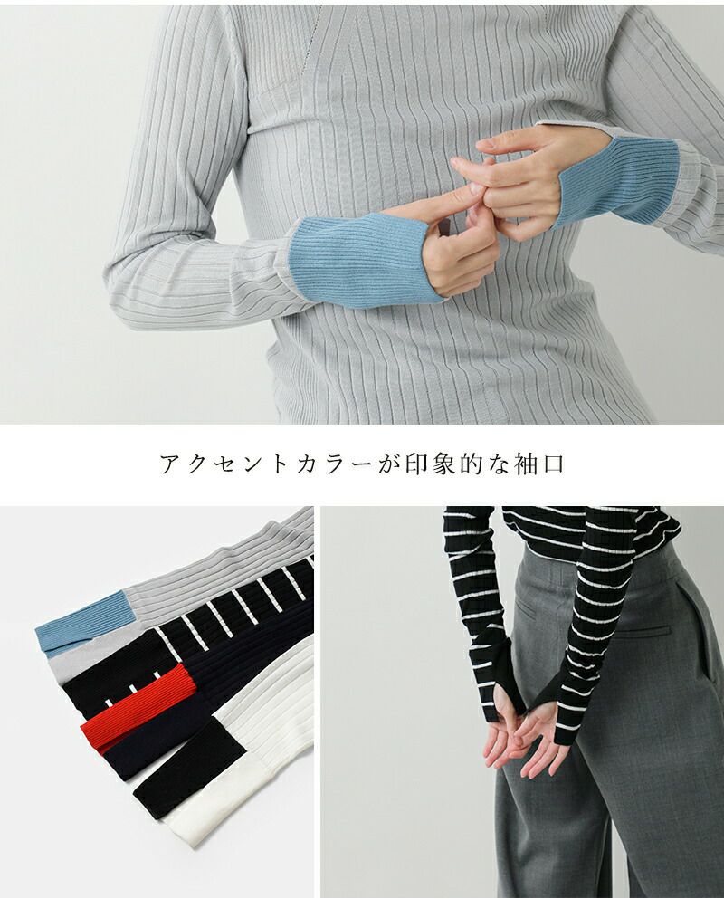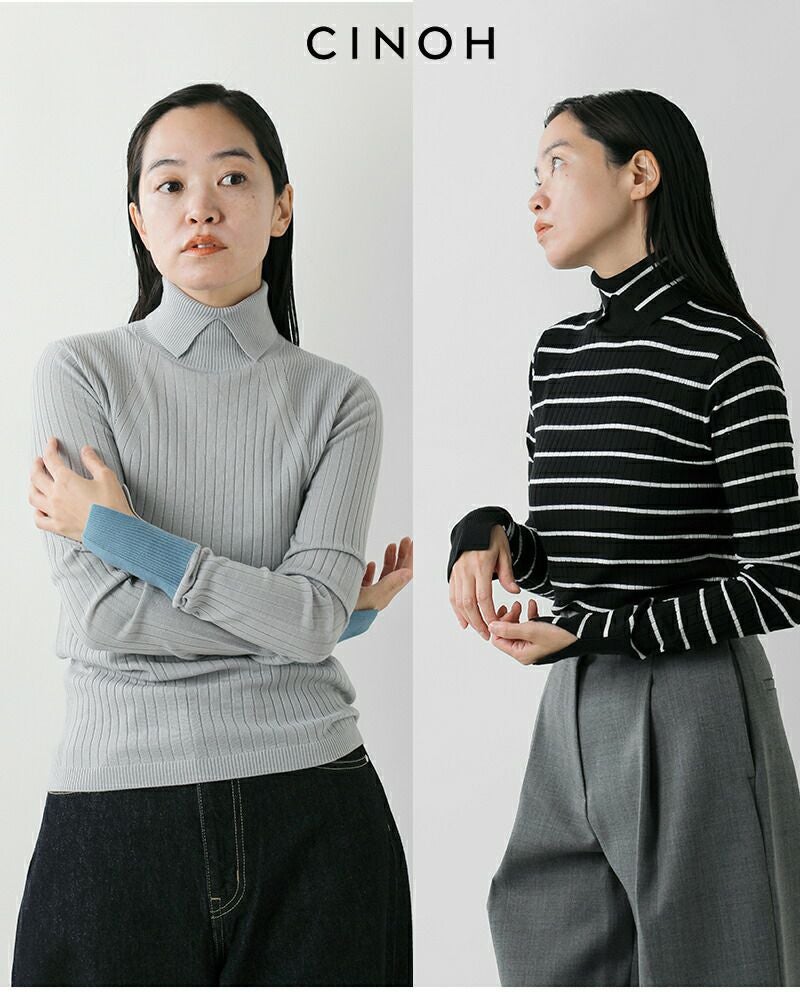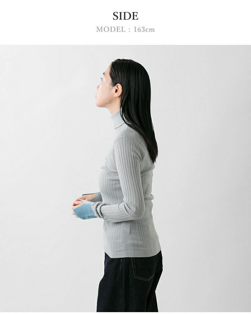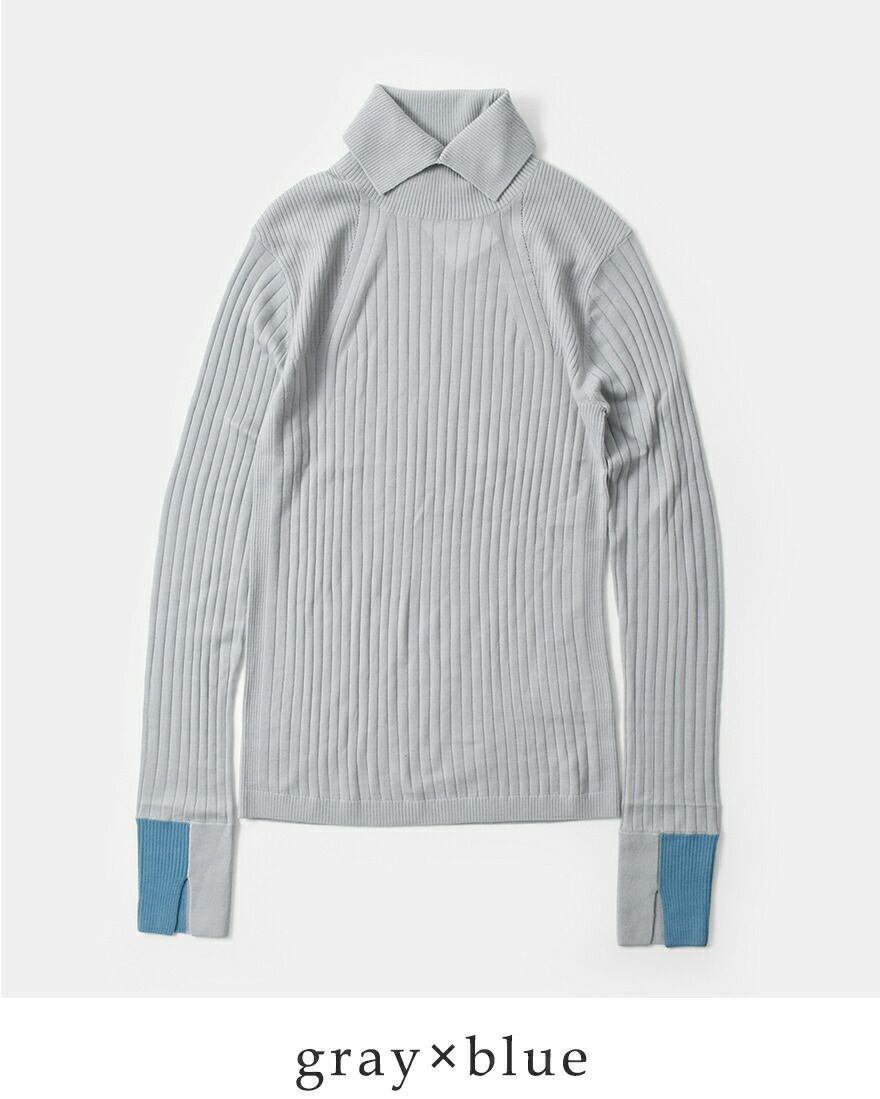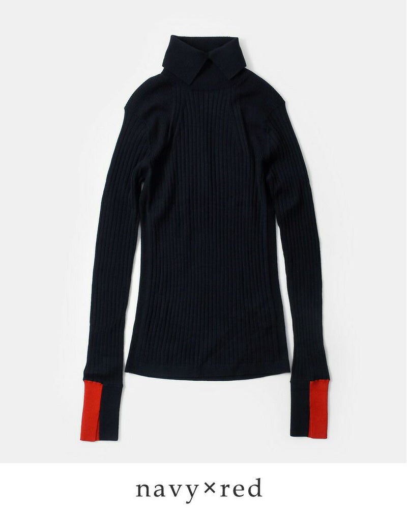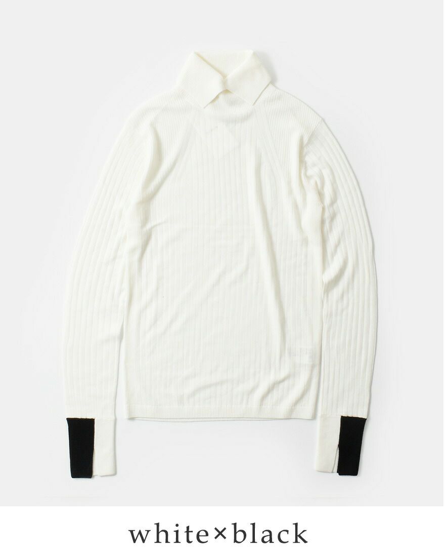 襟のようなディテールのタートルネックがポイント。また袖口を配色仕様にしたデザイン性のある一枚です。
