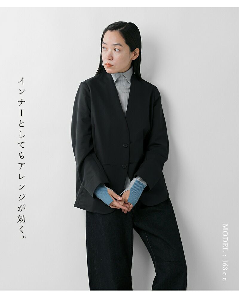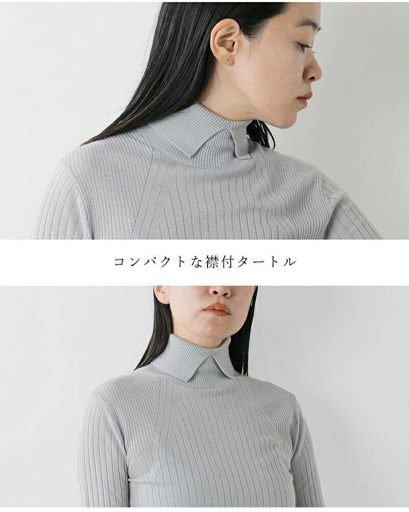 襟のようなディテールのタートルネックがお顔周りをエレガントな印象に。