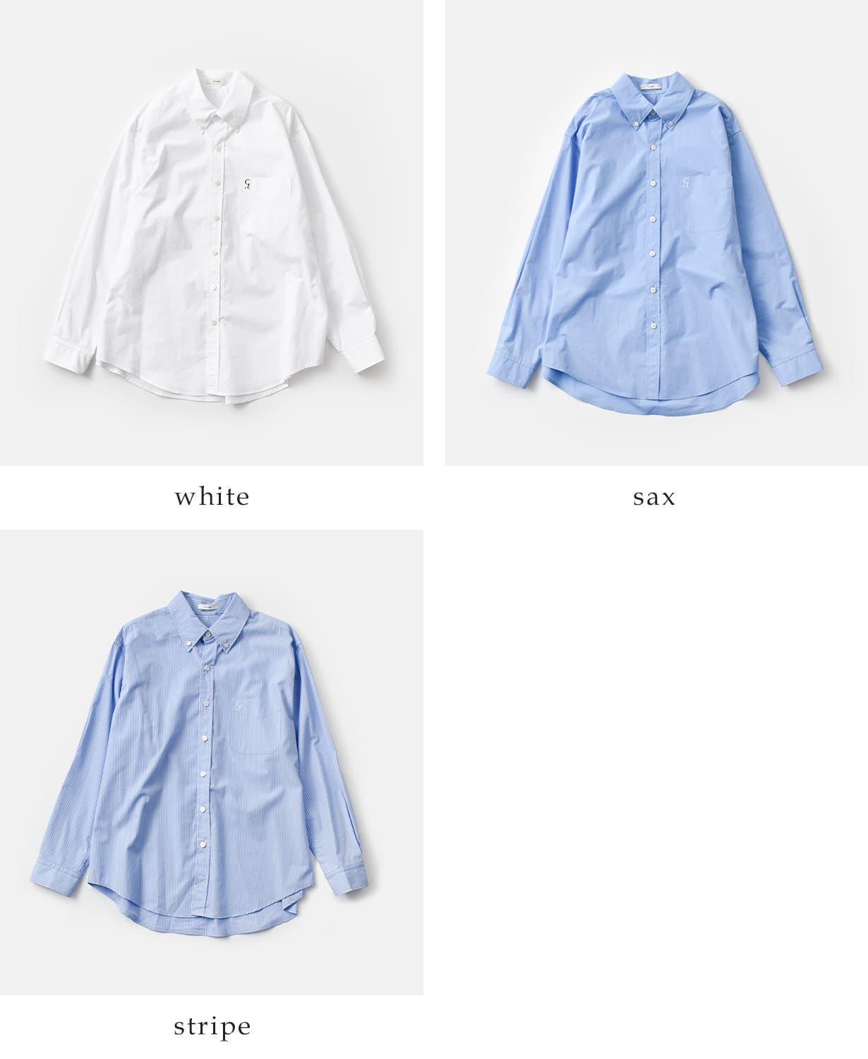 カラーにより異なる素材構成で、選ぶ楽しさも魅力のひとつ。サックスとホワイトは肌ざわりの良い綿100%で、さらりとした着心地。ストライプ柄は綿とセルロースの混紡素材を使用し、よりしなやかで落ち感のある風合いに。どちらも適度なハリ感があり通気性が良く、季節を問わず快適に着用できます。
