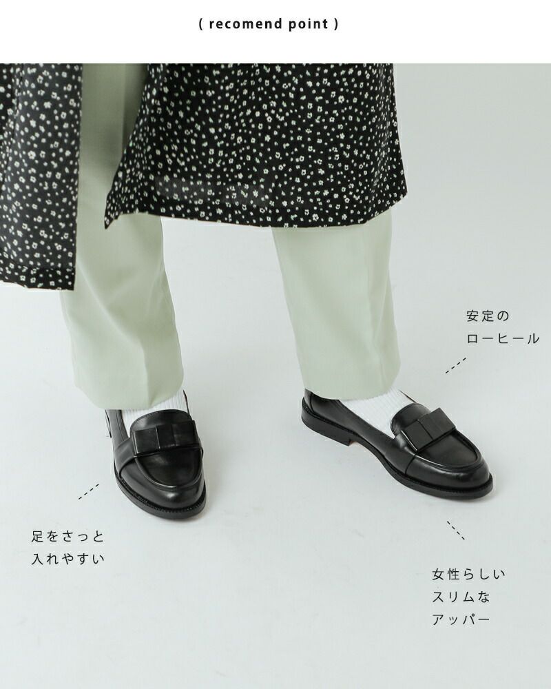 ローファーのフォーマルな印象はそのままに、アッパーにリボンをあしらうことで女性らしく、大人にちょうどいい甘さが生まれています。つま先に向かってスリムにラウンドしたアッパーが足をすっきりと見せます。
