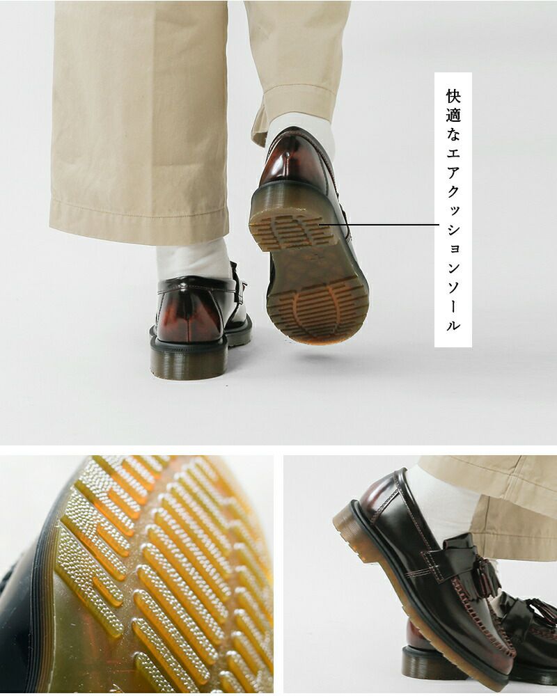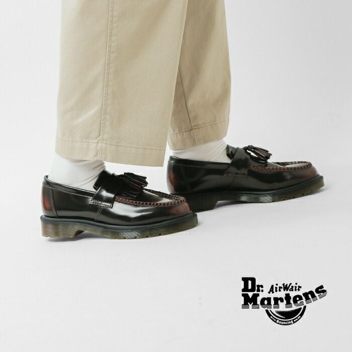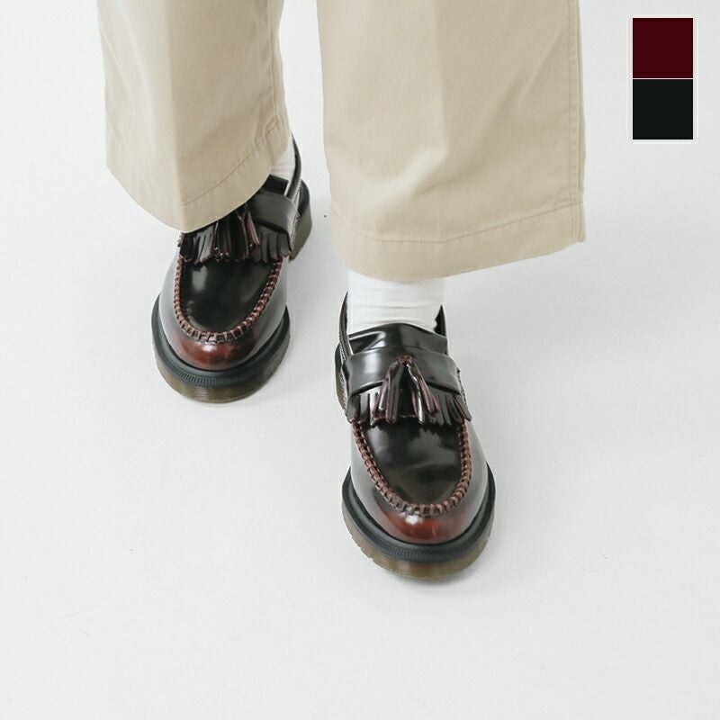 DrMartens(ドクターマーチン)よりレザータッセルローファー“ADRIAN”をご紹介します。大人気の定番タッセルローファーはドクターマーチンの最初の英国工場であるコブスレーン工場で1980年に初めて製造され、以来オフィスワーカーやスタイルに敏感な人々によって愛用され続けてきた逸品。レトロとモダンの要素を合わせ、縁飾り付きのタッセルアッパー、落ち着いたプレーンウェルト…絶妙なデザイン要素のバランスでいつの時代もトレンド感あるルックスを演出します。クラシックなシルエットを忠実に守っていますが、耐油性と対脂性に優れたソールを備え、実用性にも優れているのがおススメのポイントです◎