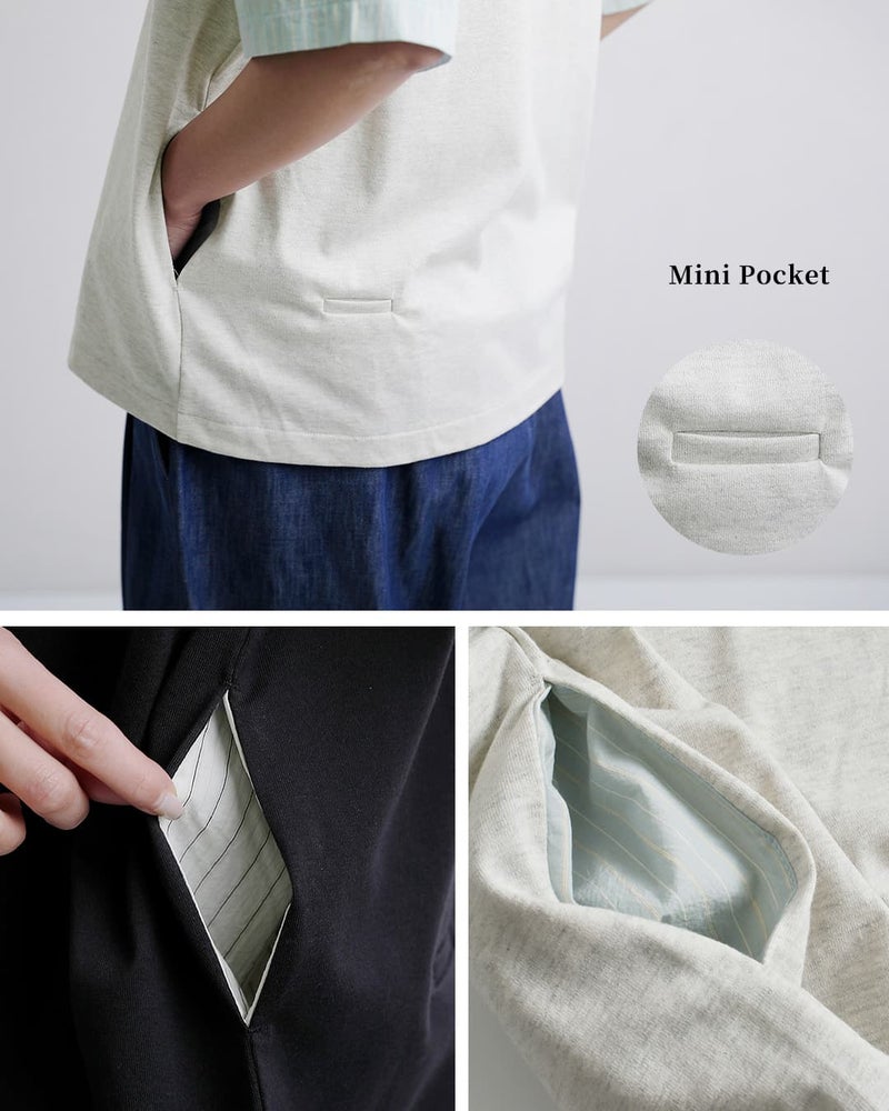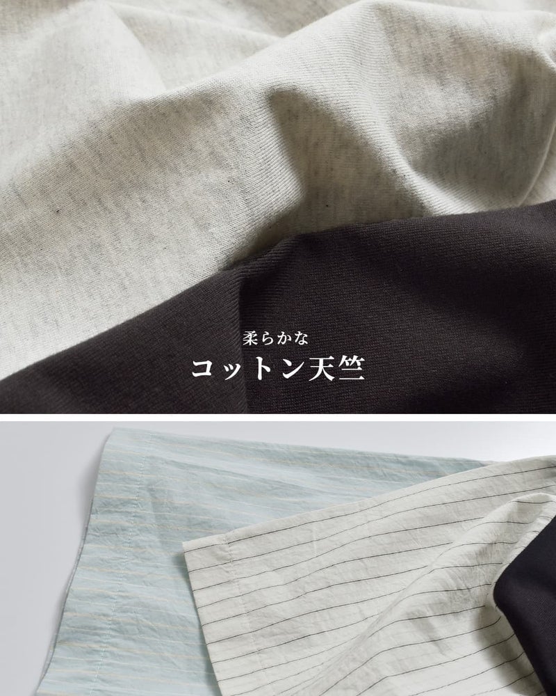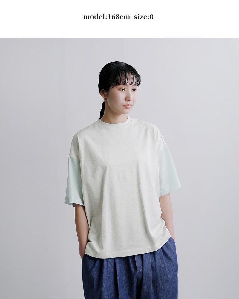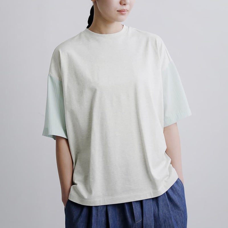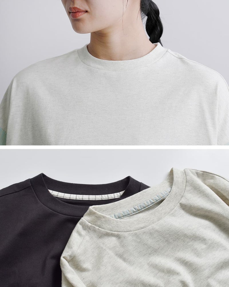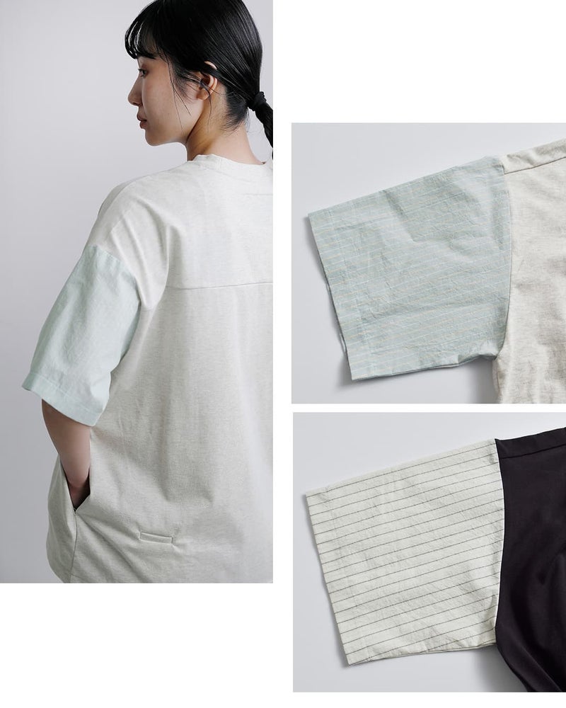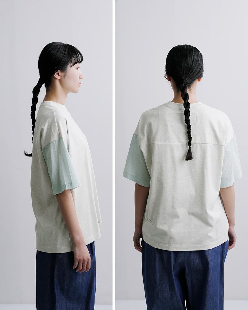 メインのカットソー生地は柔らかなコットン天竺を使用。通気性が良く吸水性に優れており、汗ばむ季節に快適な着心地を提供してくれます。お袖の生地は薄手のシャツ生地。ハリ感がありさらりとしていて肌にまとわりつかず、爽やかな生地です。
