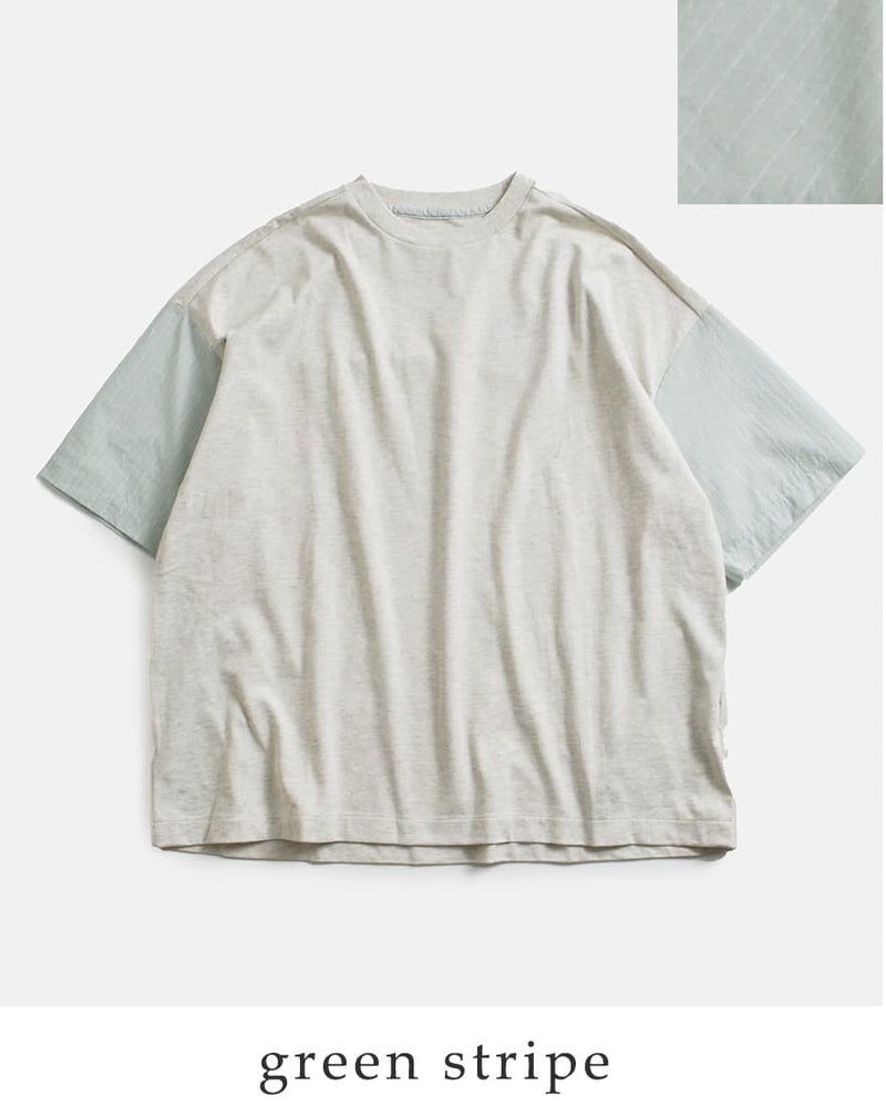 身頃には柔らかなカットソー生地、袖部分には薄手のシャツ生地を使用した切り替えデザインが特徴です。
