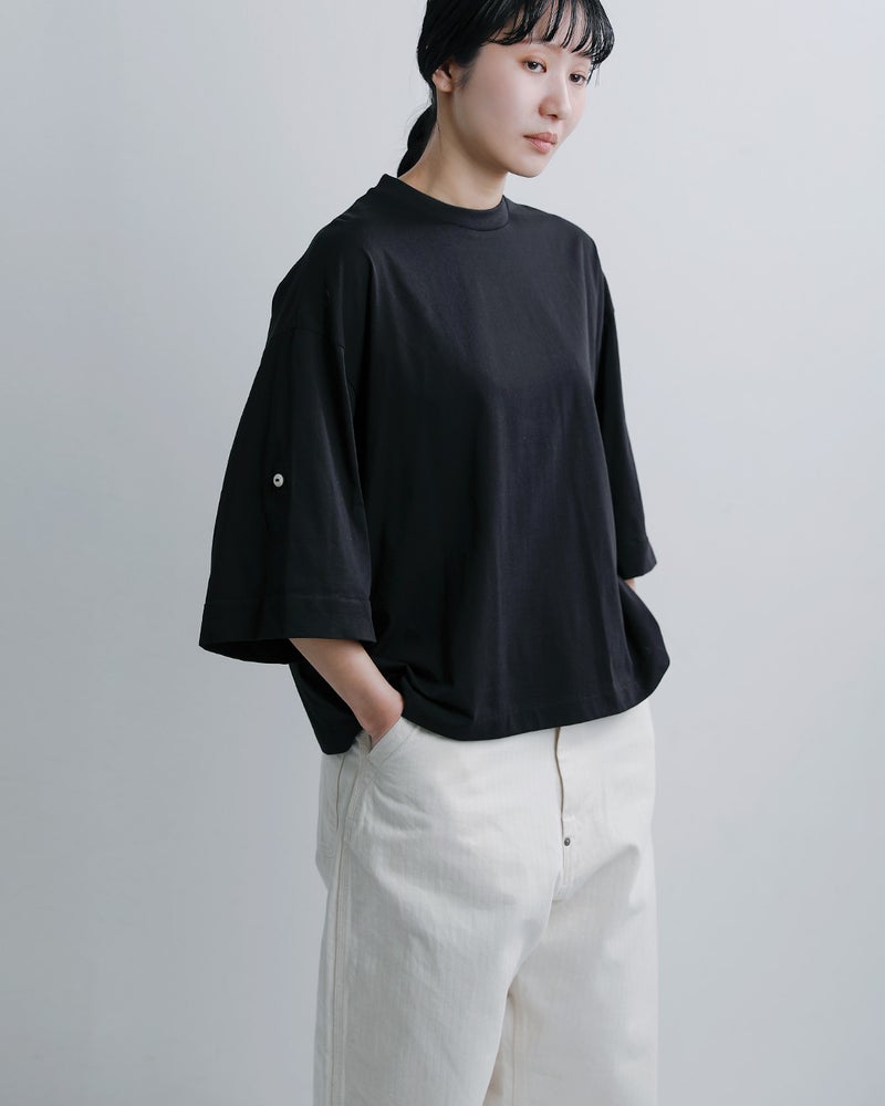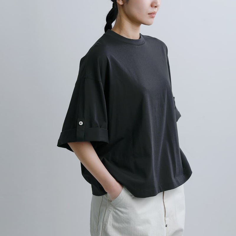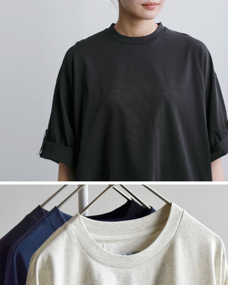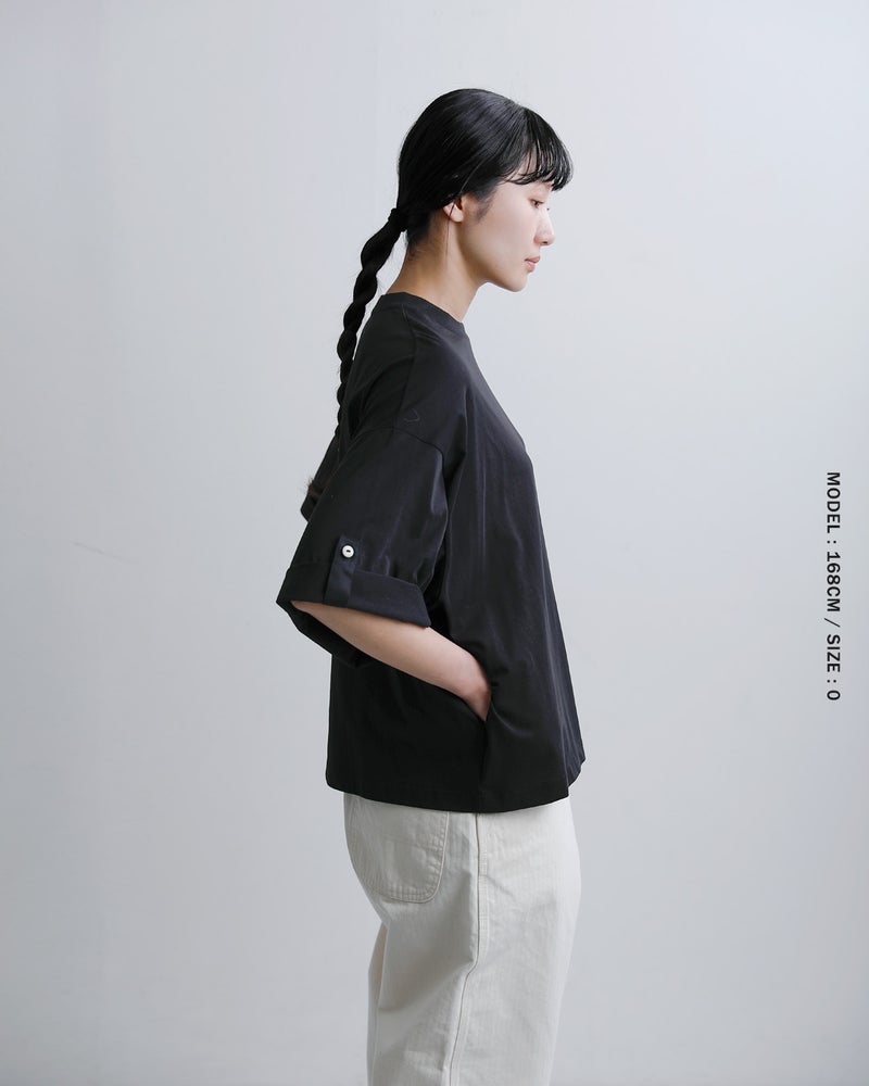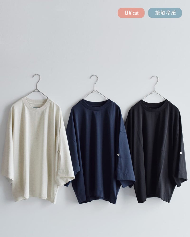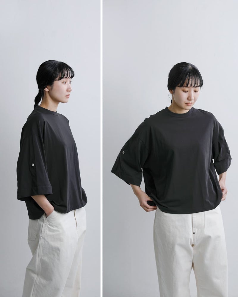 Dulcamara(ドゥルカマラ)より、UVカット・接触冷感機能を備えたコットンロールアップTシャツのご紹介です。ゆったりとしたブランドらしいオーバーシルエットに、袖の内側にはボタンとベルトを配置。ロールアップすることで、7分袖から半袖へとアレンジが可能で、気温やスタイリングに合わせて表情を変えられるのが魅力です。