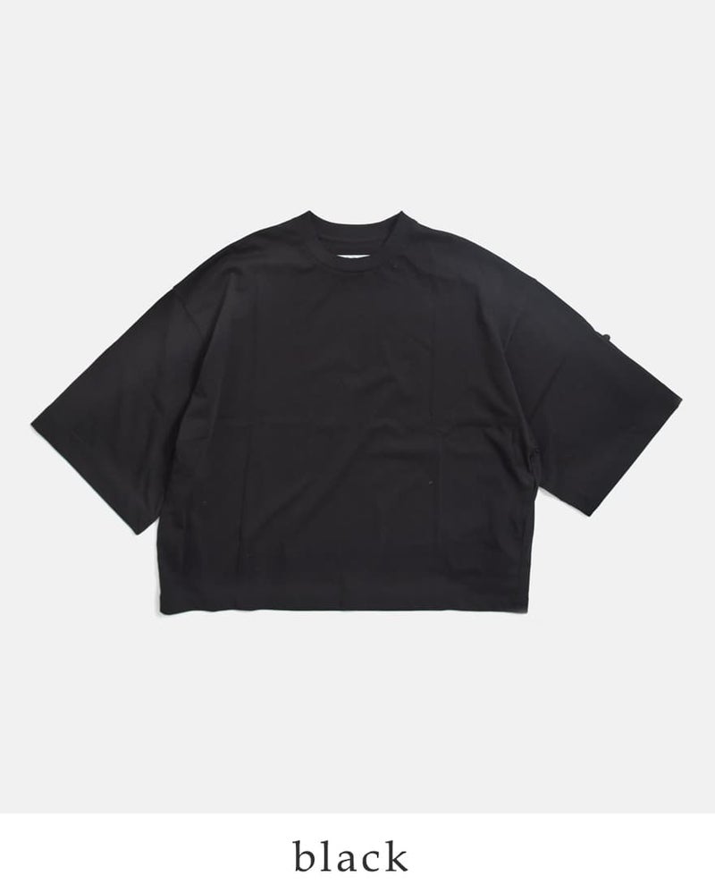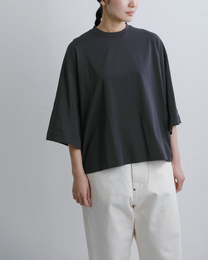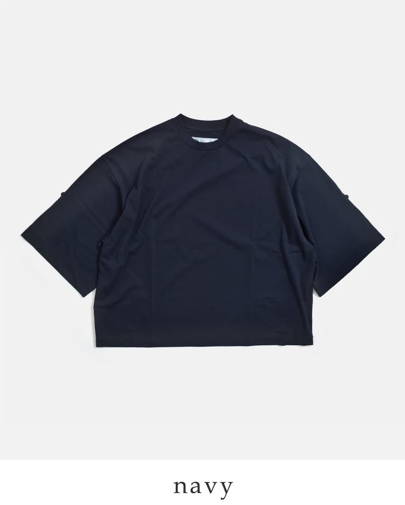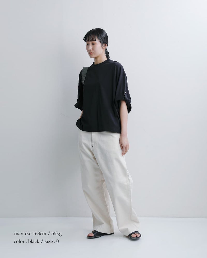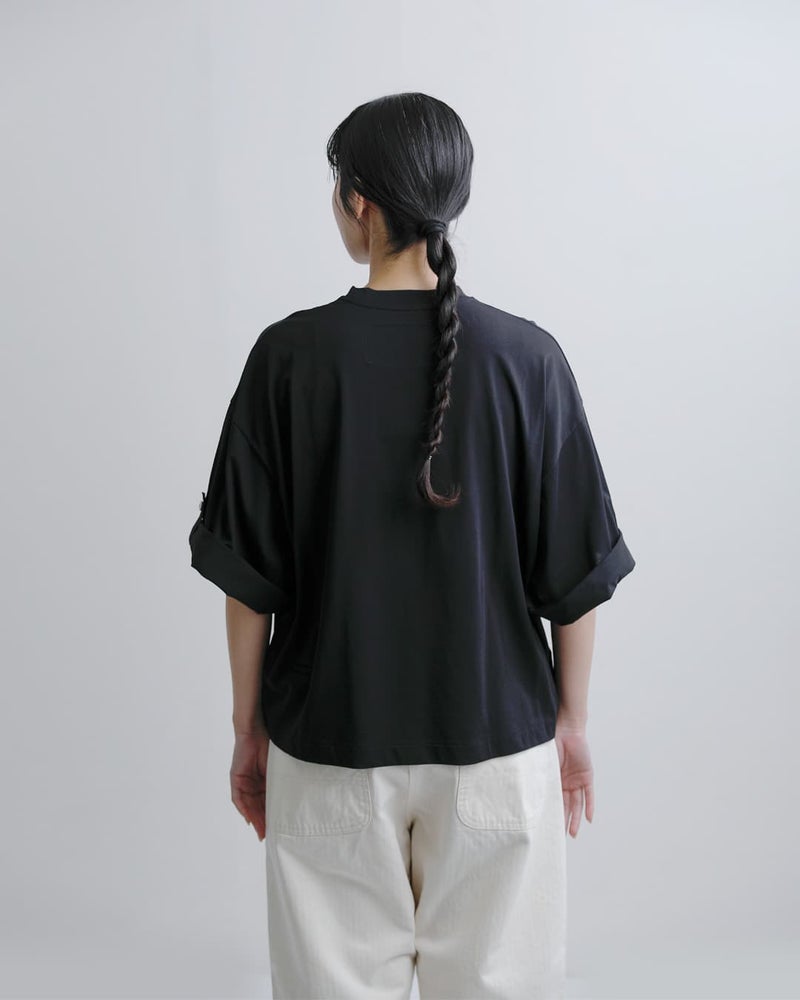 Dulcamara(ドゥルカマラ)より、UVカット・接触冷感機能を備えたコットンロールアップTシャツのご紹介です。ゆったりとしたブランドらしいオーバーシルエットに、袖の内側にはボタンとベルトを配置。ロールアップすることで、7分袖から半袖へとアレンジが可能で、気温やスタイリングに合わせて表情を変えられるのが魅力です。
