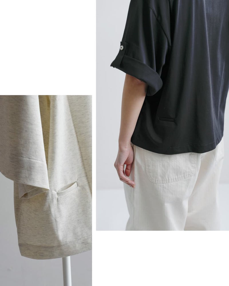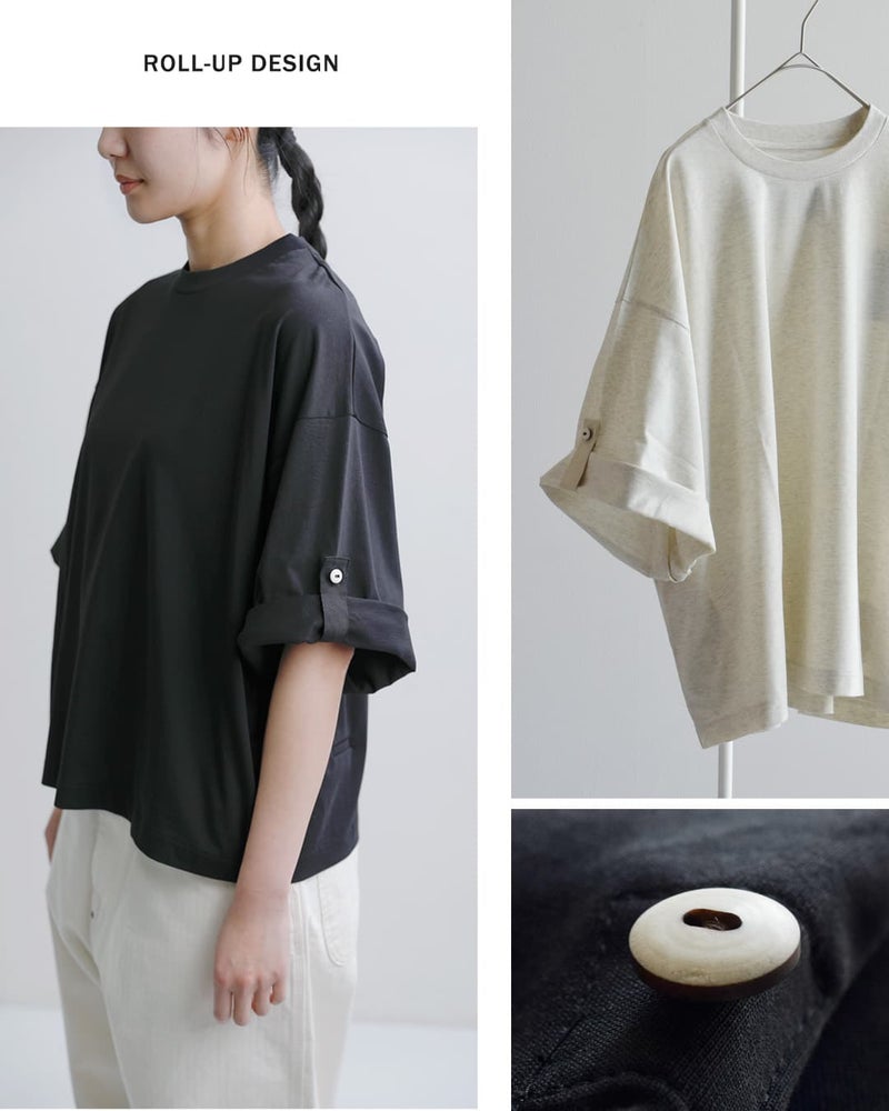 ロールアップすることで、7分袖から半袖へとアレンジが可能で、気温やスタイリングに合わせて表情を変えられるのが魅力。