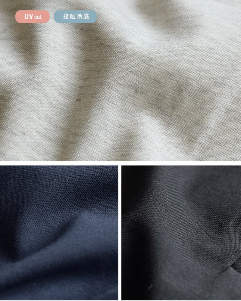 やわらかなコットン天竺素材をベースに、肌に触れた瞬間ひんやりと感じる接触冷感と、紫外線を軽減するUVカット機能をプラス。厚すぎず、薄すぎずの中肉のしっかりとした生地感です。