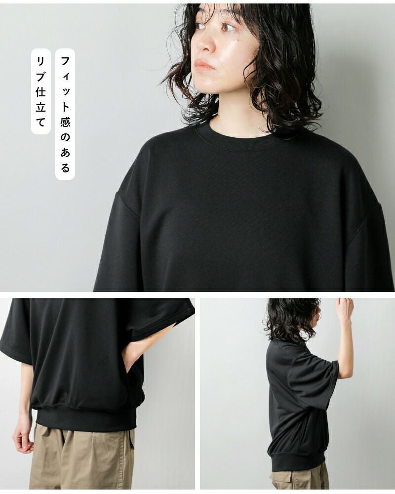 ゆったりとしたシルエットですが、身体に優しく沿うようなフィット感のあるリブ仕立てがメリハリをプラスします。サイドは伸縮性のあるフライス地を使用しています。
