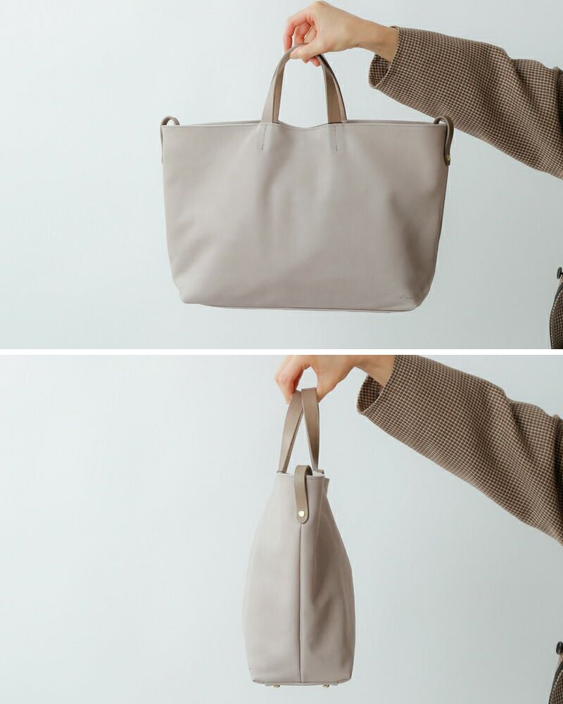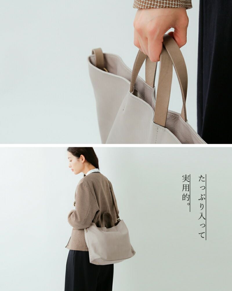 レザー本来の柔らかな素材感を活かしたシンプルなデザイン。トートバッグでオケージョン用に、おでかけの時はショルダーバッグに、と用途に合わせた使い方が可能。普段使いから通勤用、旅行に、とあらゆるシーンで活躍してくれます。