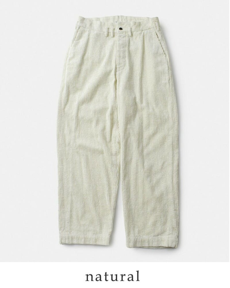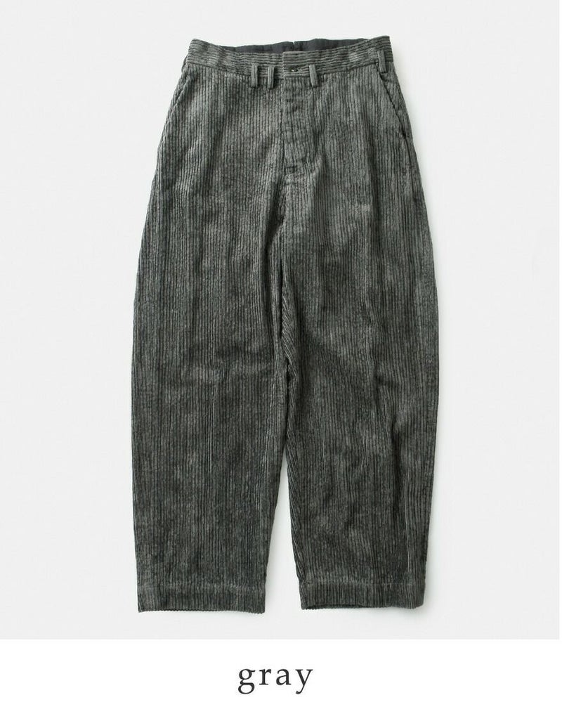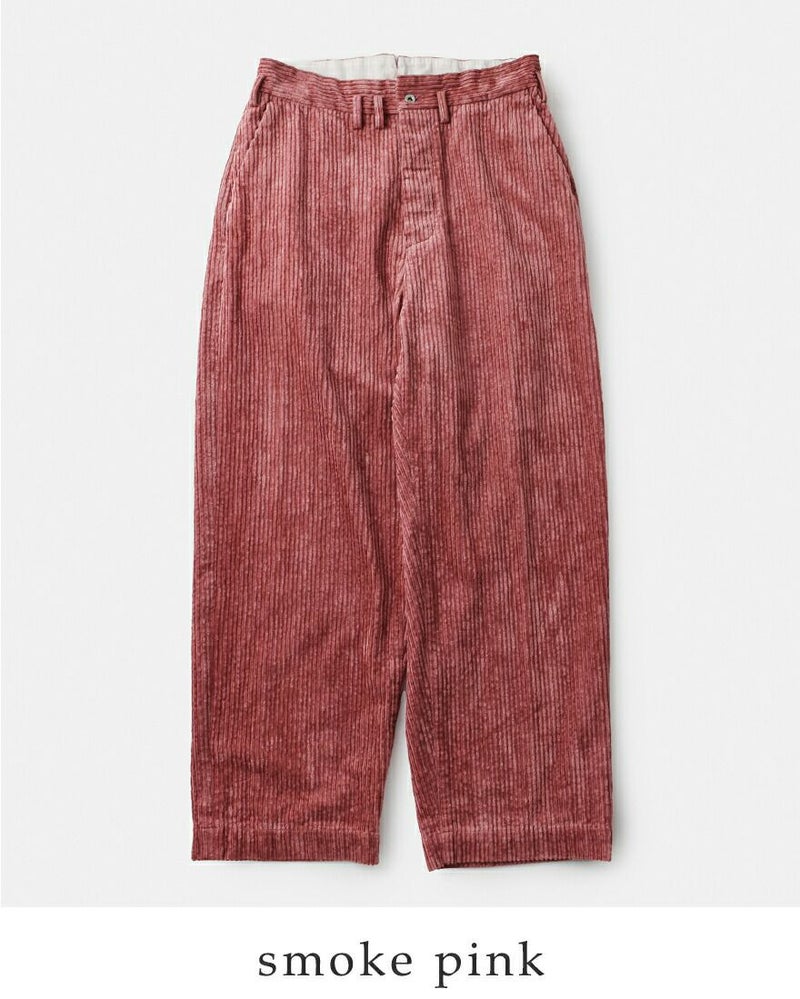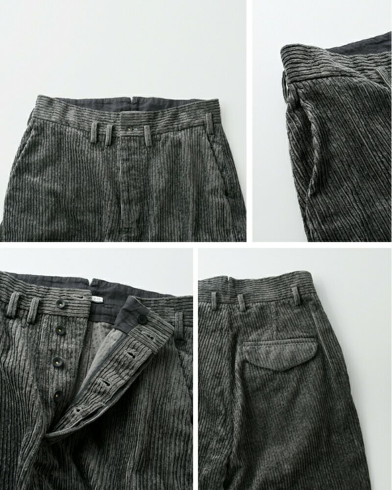 コットン58% レーヨン42% 太畝の部分が光沢のあるレーヨン糸を使用した艶のあるコーデュロイ生地です。製品洗い後タンブラー乾燥させていますので生地自体に膨らみが出てムラ感があり、味わい深い風合いに仕上がっています。柔らかくふっくらとした厚手の生地で、秋冬に暖かく穿いていただけます。