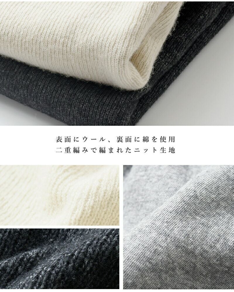表面にウール、裏面に綿を使用し二重編みで編まれたニット生地を使用。