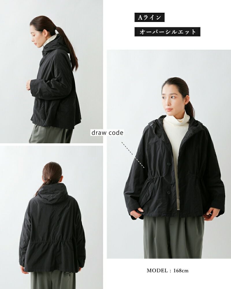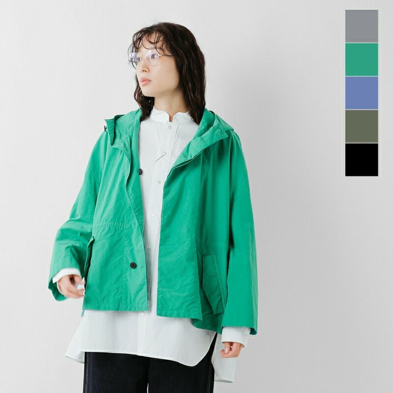 フロントは比翼仕立ての5ボタン仕様、立体感のあるコンパクトなフード、ウエスト左右にフラップポケットを配置しています。身頃の内側に、内ポケットが2つとドローコード&ストッパー付き。