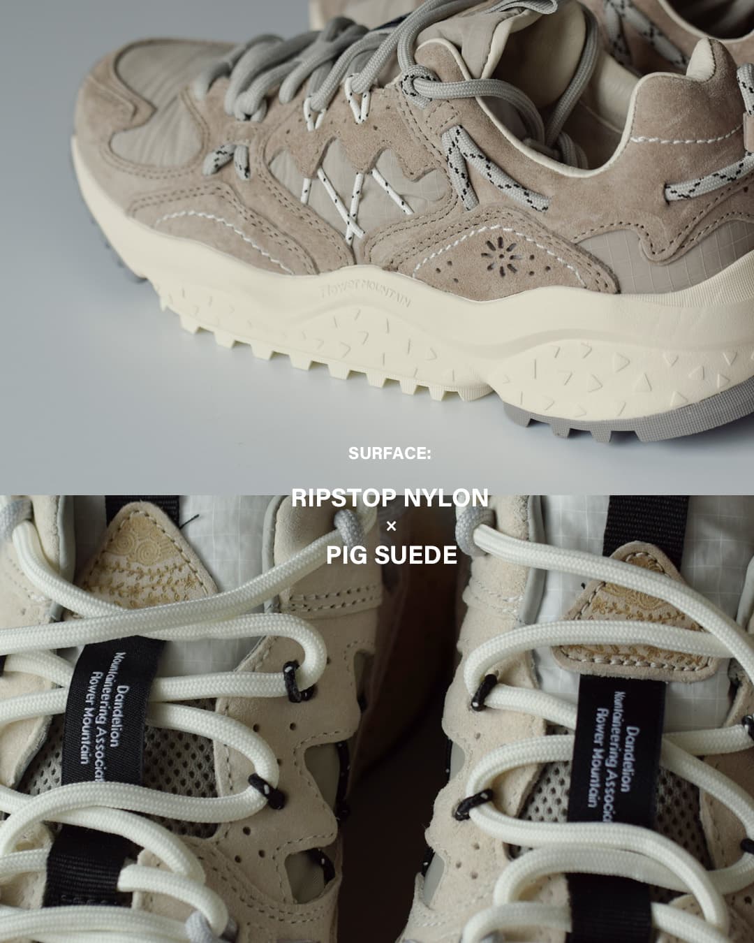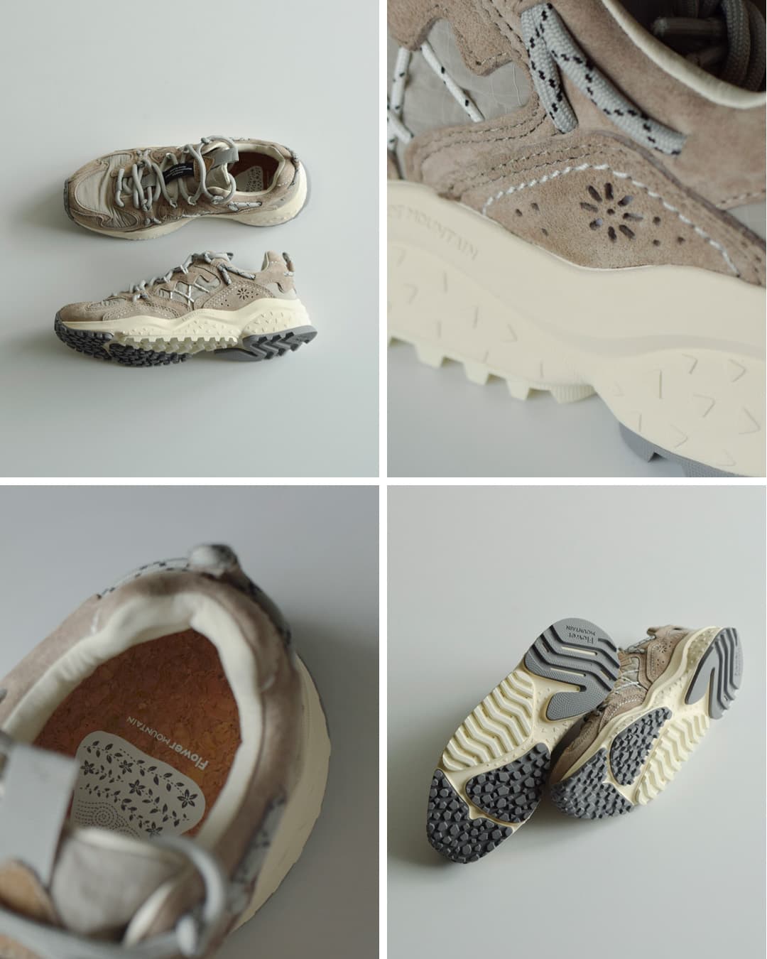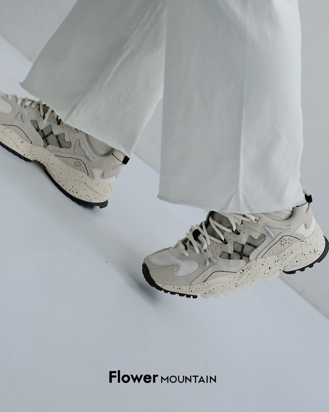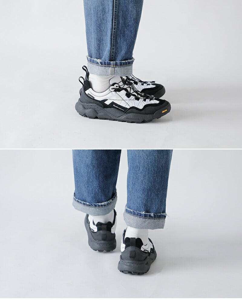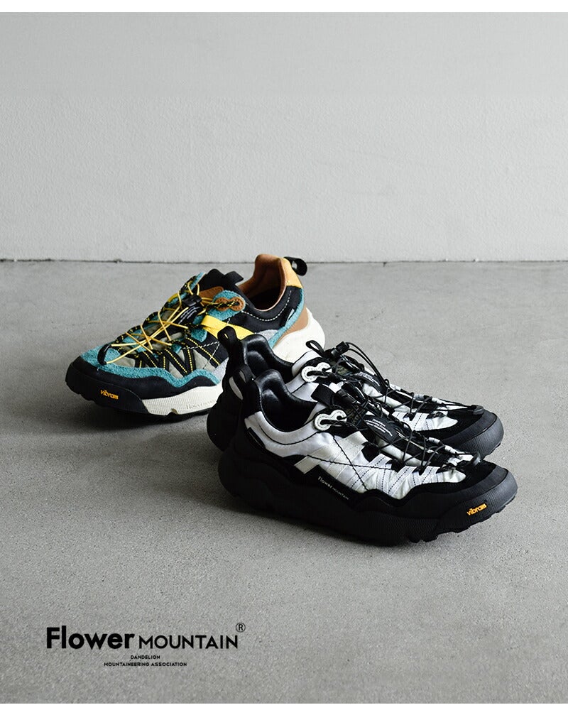 Flower MOUNTAINは2014年にデザイナーYang chaoとシューズクリエイター太田 圭輔により立ち上げられた日本のスニーカーブランド。自然をモチーフにしたデザインがコンセプトで、ファッションの側面だけでなく、足の形状に即した木型の設計や衝撃を吸収するソール、抗菌性のあるインソールなど機能性を重視したプロダクトを目指したブランドです。ストリートでの使用はもちろん、キャンプやアウトドアシーンでの使用を想定されています。
