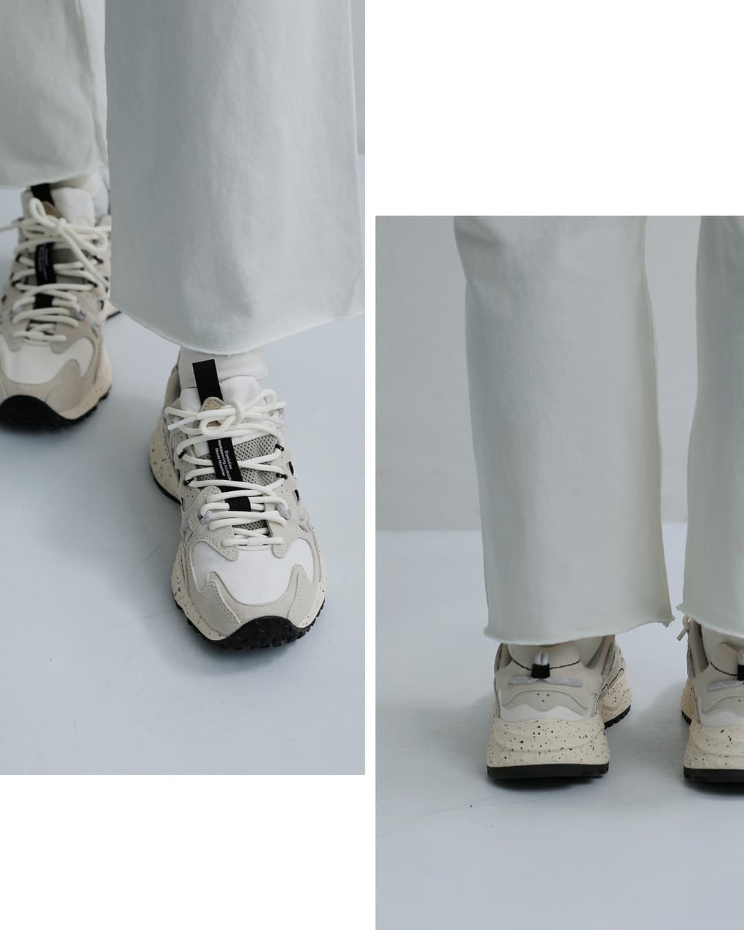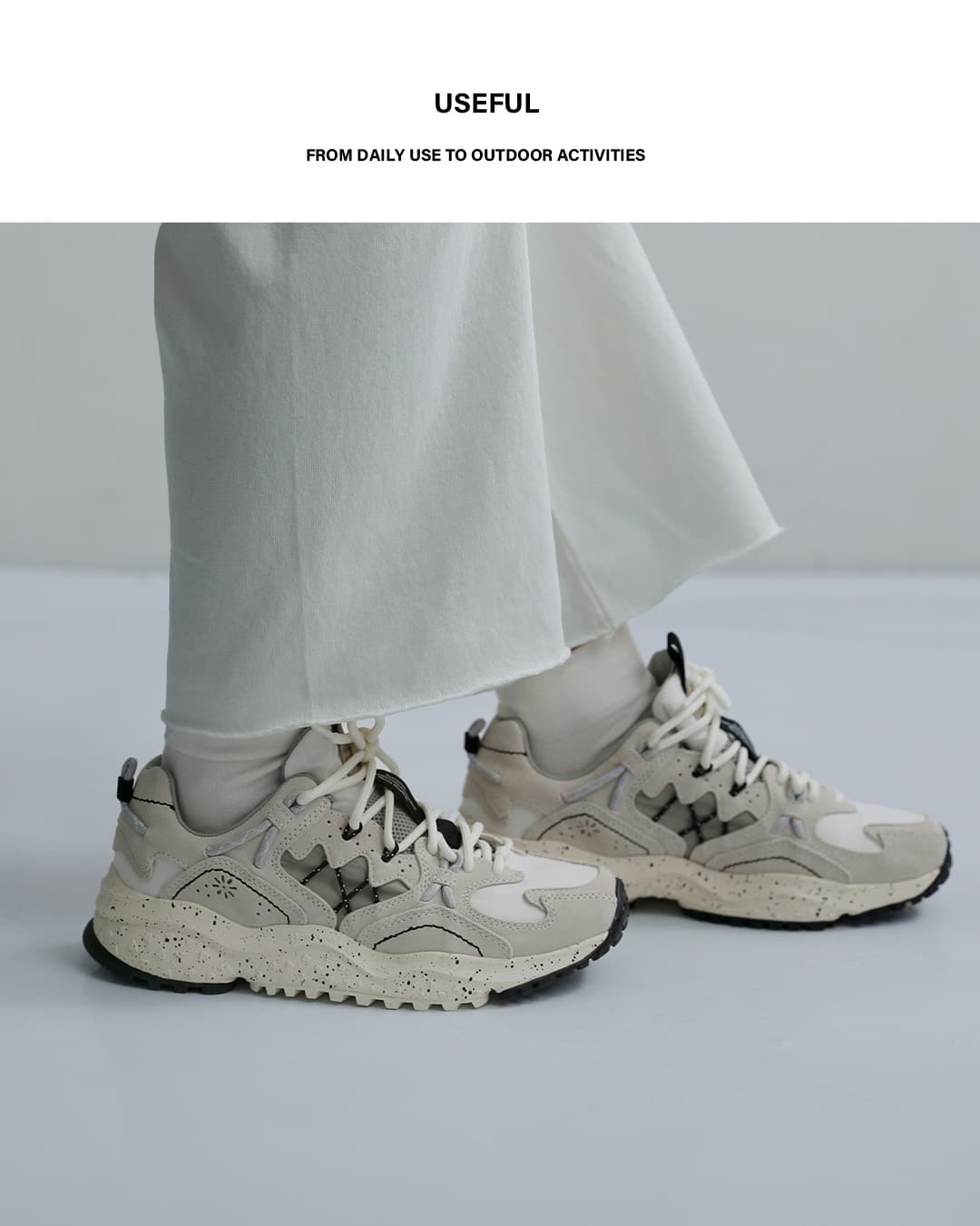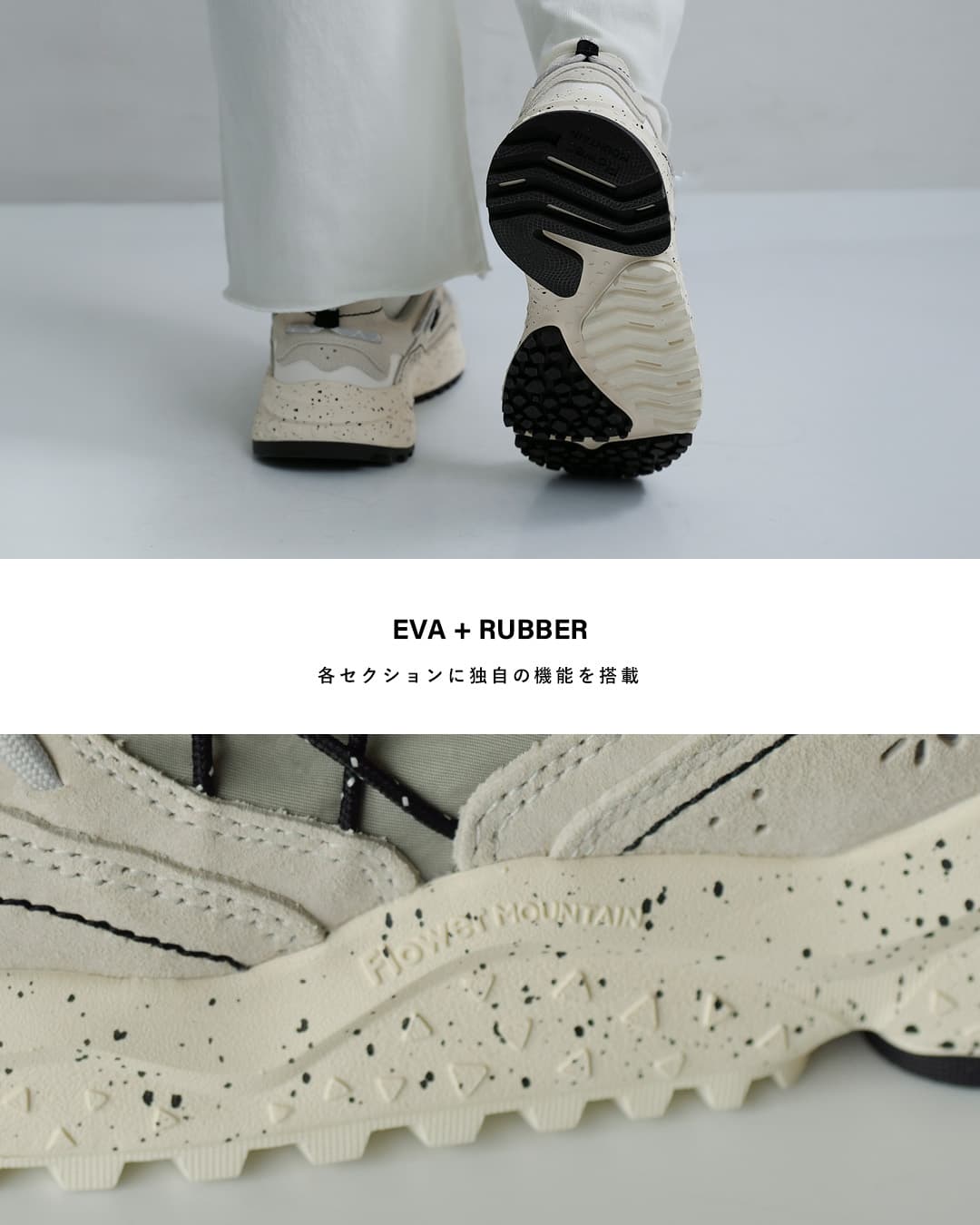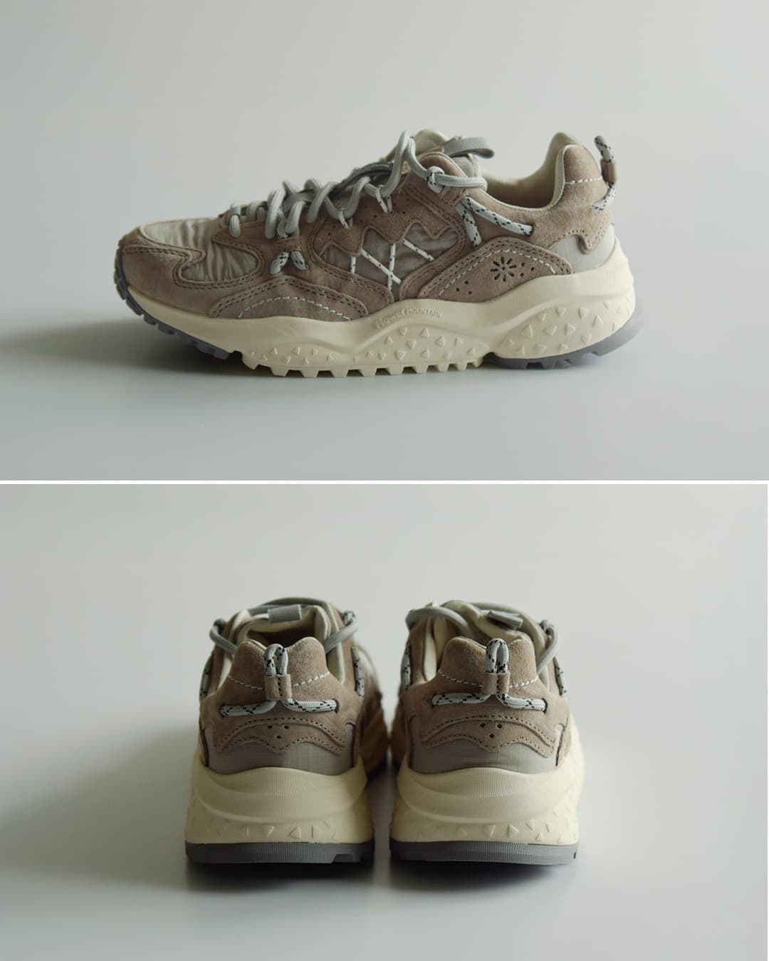 Flower MOUNTAINは2014年にデザイナーYang chaoとシューズクリエイター太田 圭輔により立ち上げられた日本のスニーカーブランド。自然をモチーフにしたデザインがコンセプトで、ファッションの側面だけでなく、足の形状に即した木型の設計や衝撃を吸収するソール、抗菌性のあるインソールなど機能性を重視したプロダクトを目指したブランドです。ストリートでの使用はもちろん、キャンプやアウトドアシーンでの使用を想定されています。