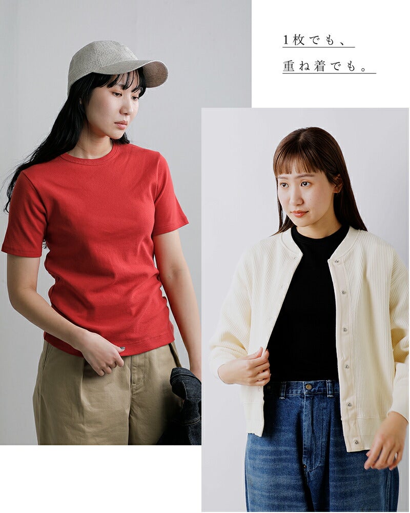 とても柔らかで肌触りの良いジチピオリジナルのコットンフライスを使用。リブ編みで伸縮性に優れており、身体の動きに合わせてしなやかに伸び縮みしてくれます。適度な重みがあることで、緩やかなドレープ感があります。また編地段階で、水通し、タンブル乾燥されているので、製品が縮みにくくなっています。