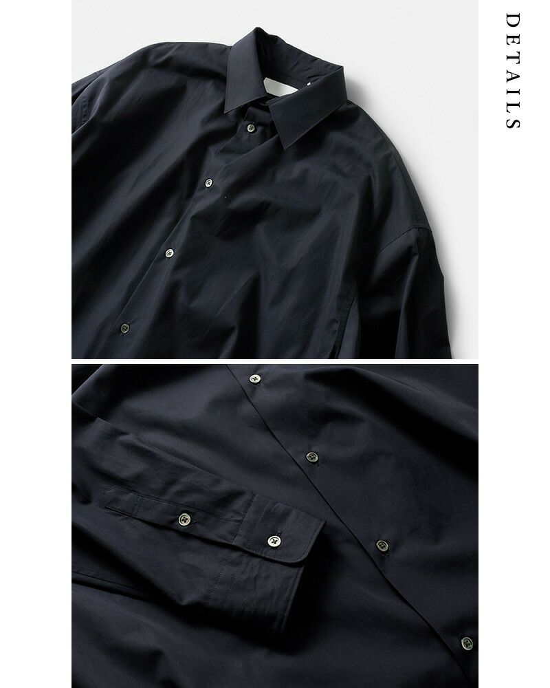 graphpaper(グラフペーパー)よりハイカウント ブロード オーバー シャツワンピース “High Count Broad Regular Oversized Shirt Dress”のご紹介です。しなやかで適度な光沢感を放つスーピマコットンを用いて限界に近い密度に織り上げたクリアな表情とハリ感が特徴のハイカウントブロードを使用したシャツワンピース。オーバーサイズで、背中のインバーテッドプリーツが動きとともに広がり、エレガントな雰囲気を醸し出します。前後差寸のあるヘムラインが足さばきの良さを実現し、ちらりと見せるボトムで個性を主張できるデザインです。フロントのボタンの留め具合で雰囲気を変えて楽しめるアイテムです。