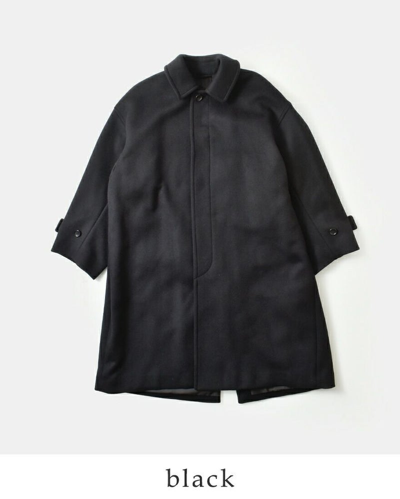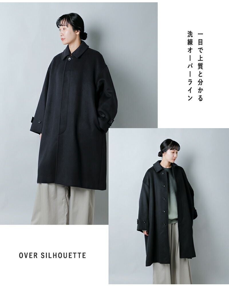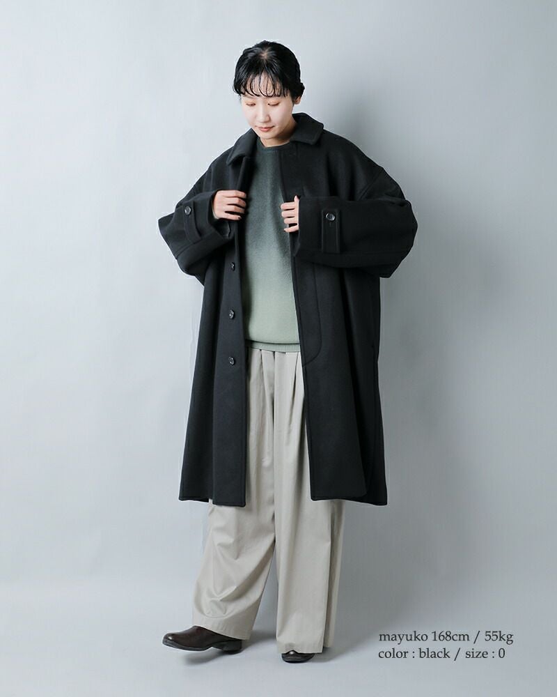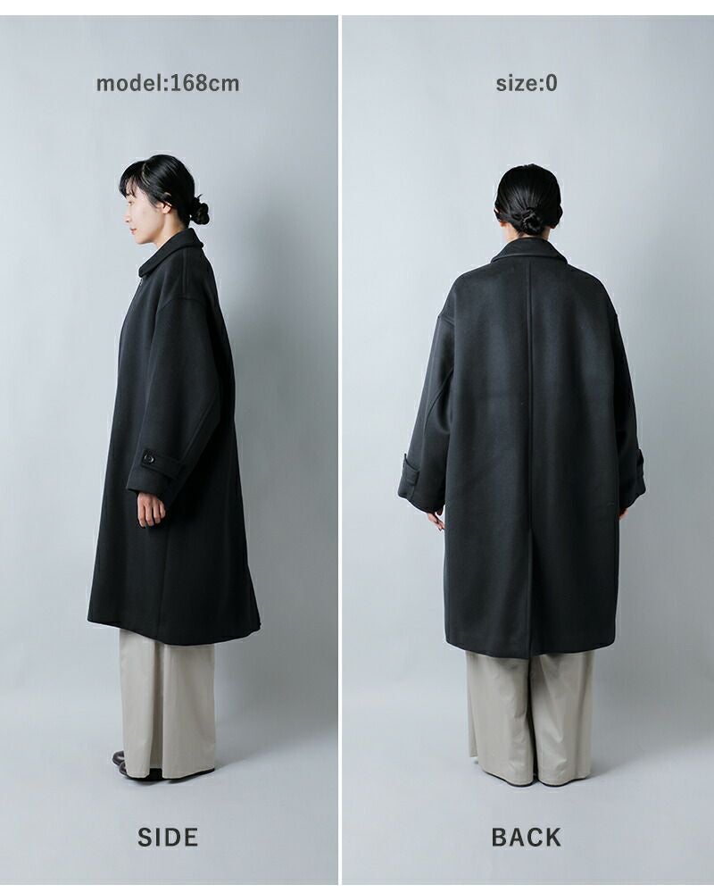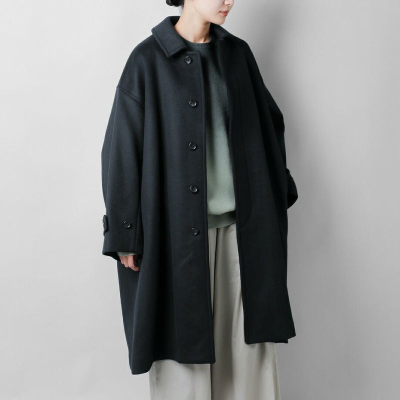 軽やかなメルトン素材は前を開けて着ても自然に落ち、ほどよいドレープが生まれます。ロング丈ならではのゆるやかなラインが、日常の動きにやさしく寄り添うシルエットです。