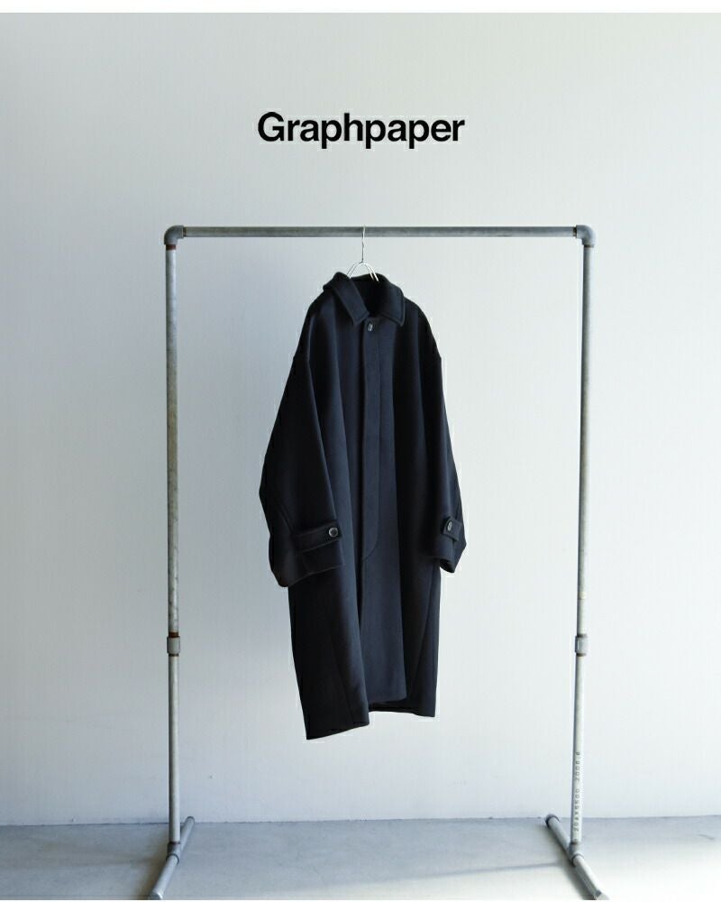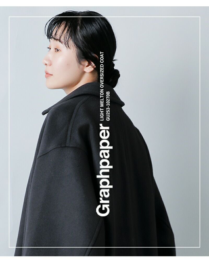 graphpaper(グラフペーパー)より、ライトメルトン オーバーサイズ ロングコート “Light Melton Oversized Coat”のご紹介です。 SUPER140’s原料を使用したダブルメルトンのショールカラーコート。原料そのものが持つ上質な風合いに加え、中糸に水溶性糸を組み合わせることで、驚くほどの軽さとふくらみを実現しています。暖かな空気をしっかり閉じ込める保温性に優れながら、重さを感じさせない快適な着心地が魅力です。 表面はショートビーバー仕上げを施し、フラットで洗練された表情と、自然な膨らみのある上品な仕上がりに。たっぷりとした分量感を持つオーバーサイズ設計は、構築的なシルエットを生み出しつつ、動きを妨げない軽快さも両立しています。纏うだけで上質さが伝わる、洗練された大人のアウターです。