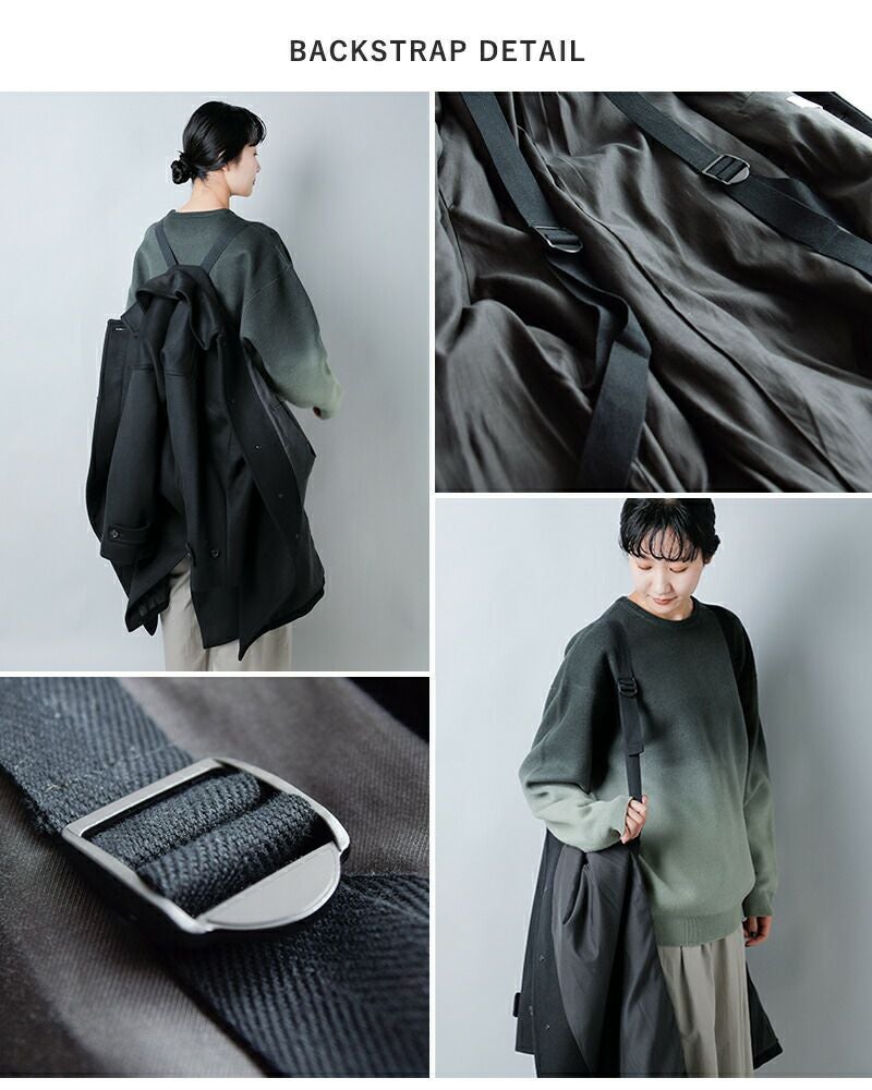 内側には長さ調整が可能なバックストラップを備えています。室内に入ったときや、サッと脱ぎたいシーンでも、リュックのように肩に掛けてスマートに持ち運べる便利な仕様です。