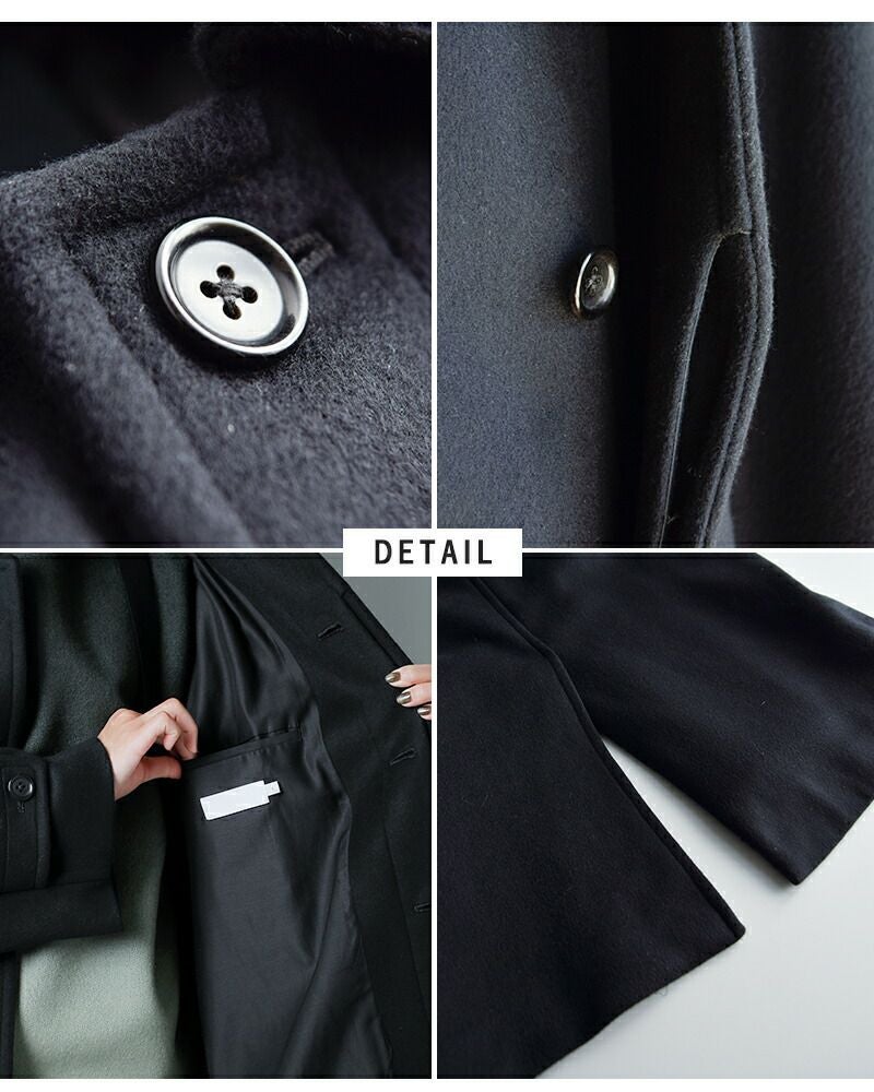SUPER140’s原料をブレンドしたダブルメルトンは、しなやかで軽やかな膨らみと保温性が特徴。ショートビーバー仕上げの滑らかな表面感が、オーバーサイズの美しいシルエットを引き立てます。インナーにはさらりとしたレーヨンコットン素材を使用し、快適な着心地を実現しました。