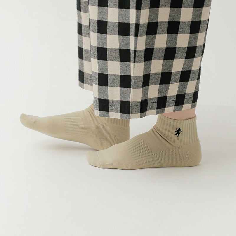 Gymphlex(ジムフレックス)よりロゴ刺繍 ショートソックスのご紹介です。光沢感のあるポリエステル先染め糸を使用し、軽やかでクリーンな印象に仕上げたショート丈ソックス。染色工程で柔らかさを引き出した糸を用いることで、しなやかな履き心地と程よいフィット感を実現しています。足首部分に施されたブランドロゴ刺繍がさりげないアクセントとなり、シンプルなスタイリングにも程よい存在感をプラス。スニーカーやローファー、サンダルまで幅広い足元に合わせやすいデザインです。定番カラーでの展開のため、デイリーユースはもちろん、ギフトにもおすすめの一足です。