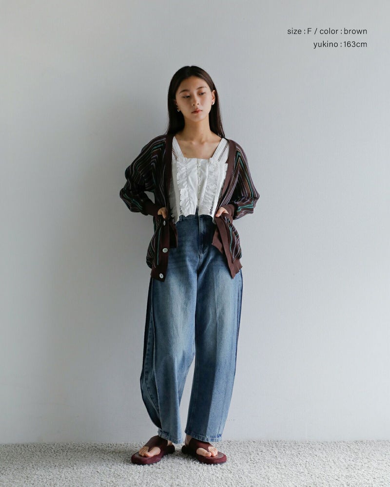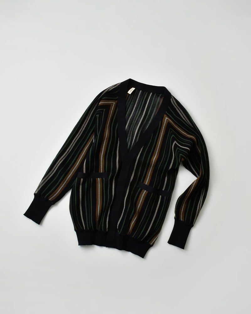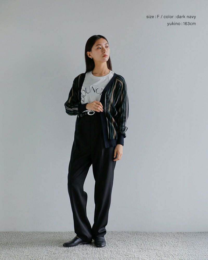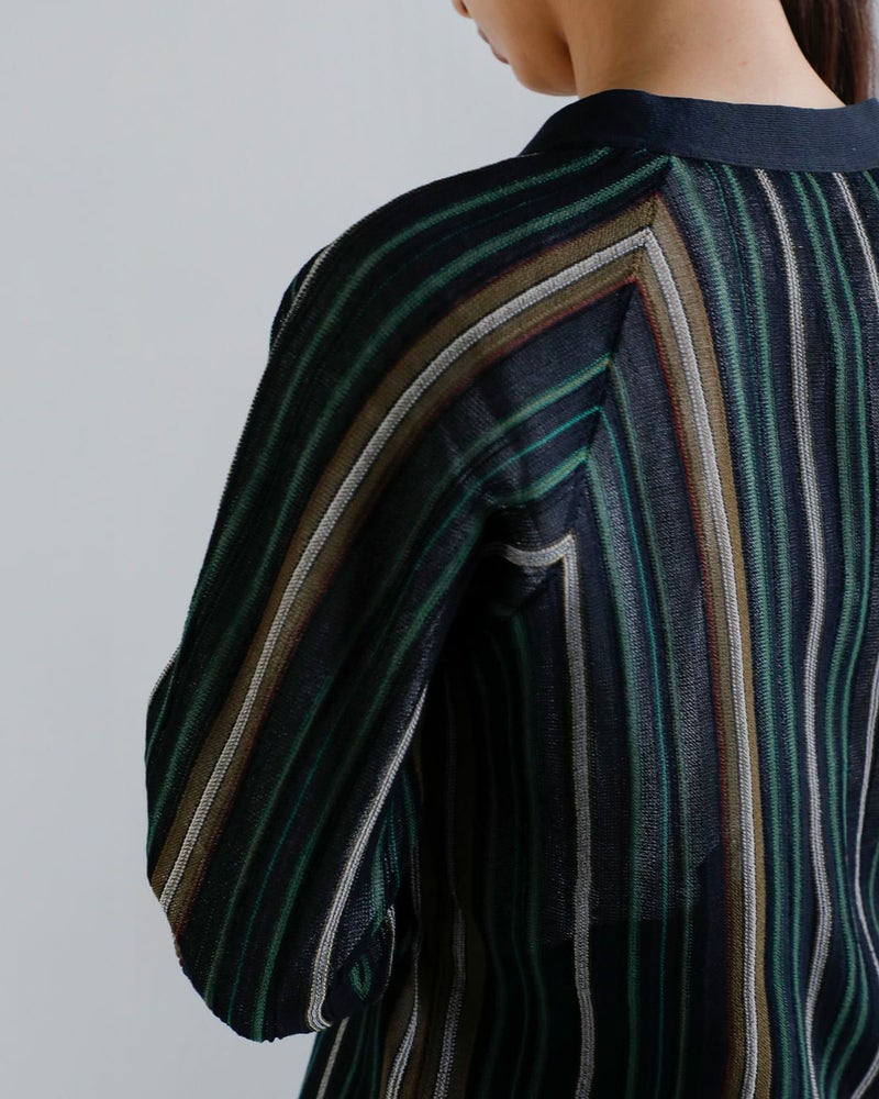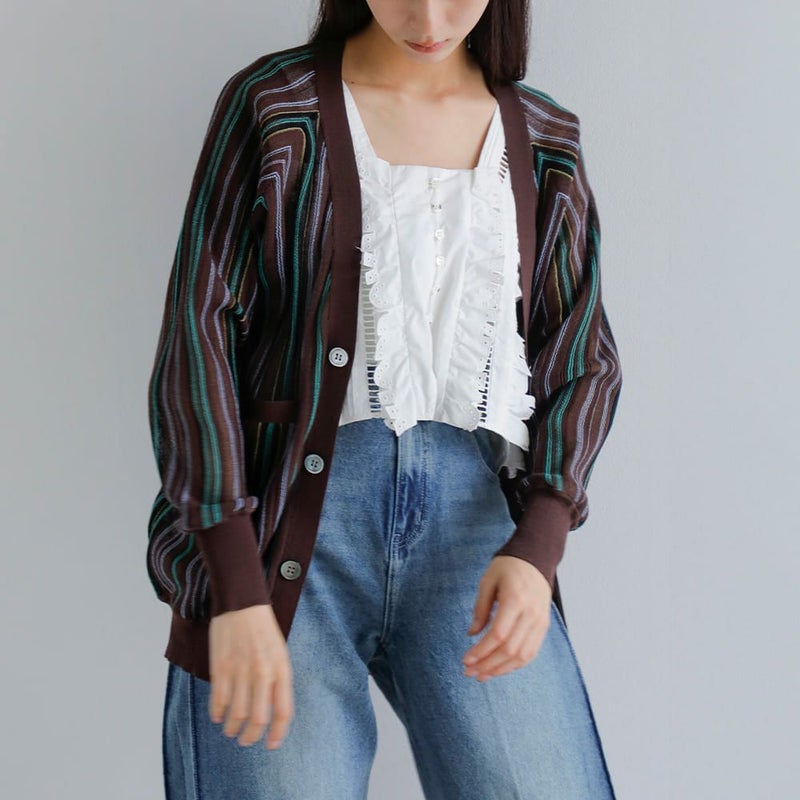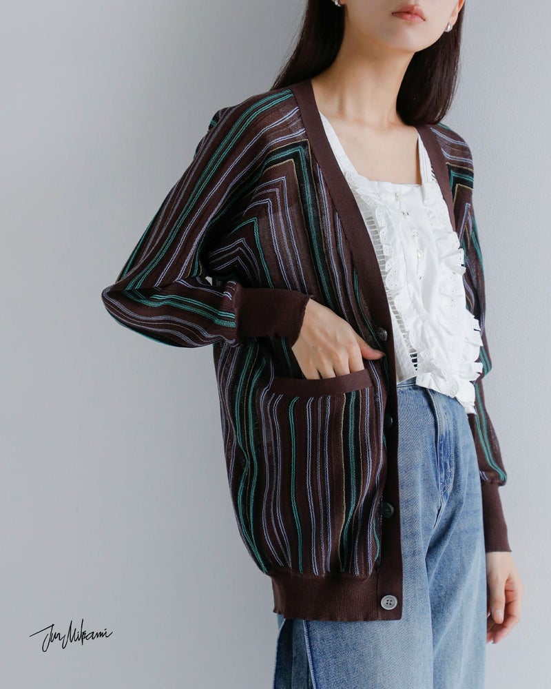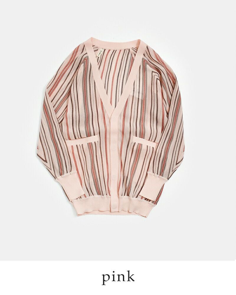 透け感のある素材にストライプ配色が映えるカーディガン。軽く伸縮性のある清涼感のある生地で、さっと羽織るだけでスタイルに軽さとリズムを与えてくれます。フロントには光沢のある4つのボタンを比翼仕様で配し、ミニマルで洗練された印象に仕上げています。ボタンを閉じればVネックとしてすっきりと着こなせ、開けて羽織れば抜け感のあるスタイルに。袖口と裾にはリブを配しており、全体に自然なメリハリをプラス。フロントにはポケットも備えられ、使い勝手の良い一枚です。