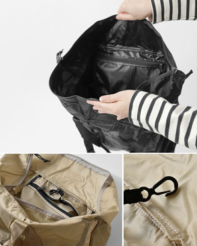フロントにポケットを二つ配置し、小物収納も便利。30Lの大容量にもかかわらず、重さはわずか約240gと軽量。普段からバッグに入れておけば、ショッピングバッグとしても使用できて、デイリーでも重宝するアイテムです。