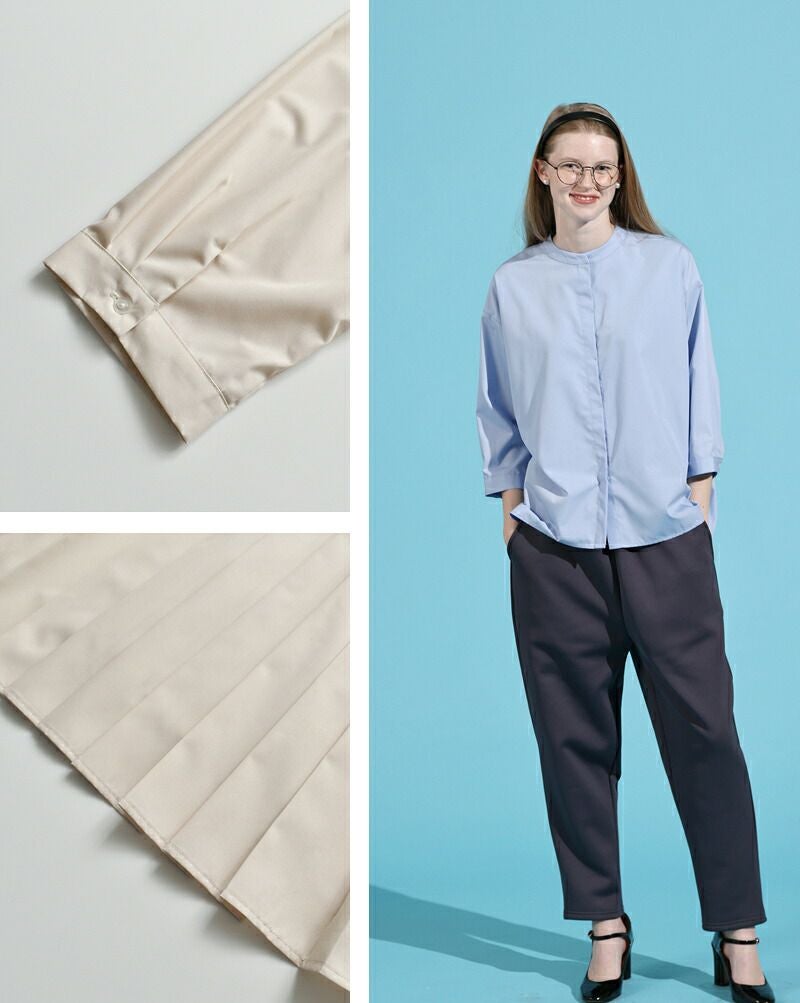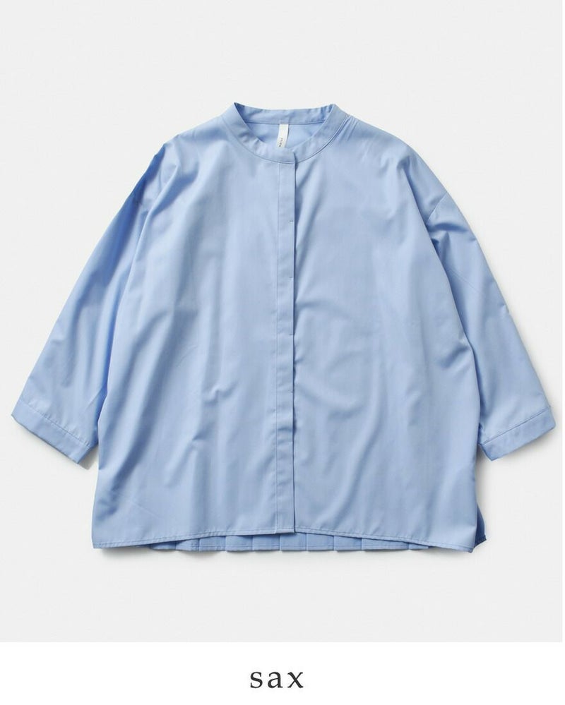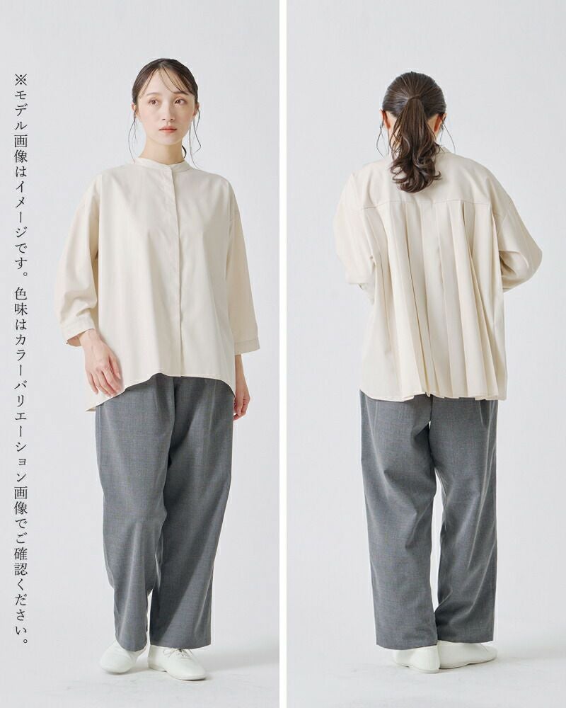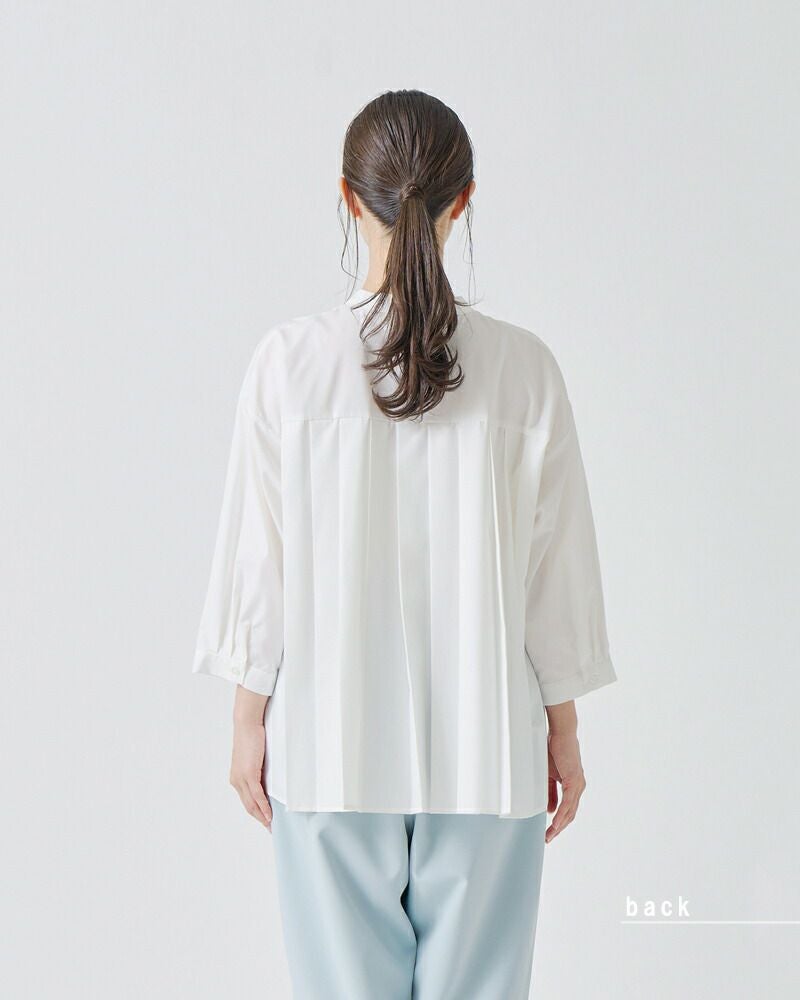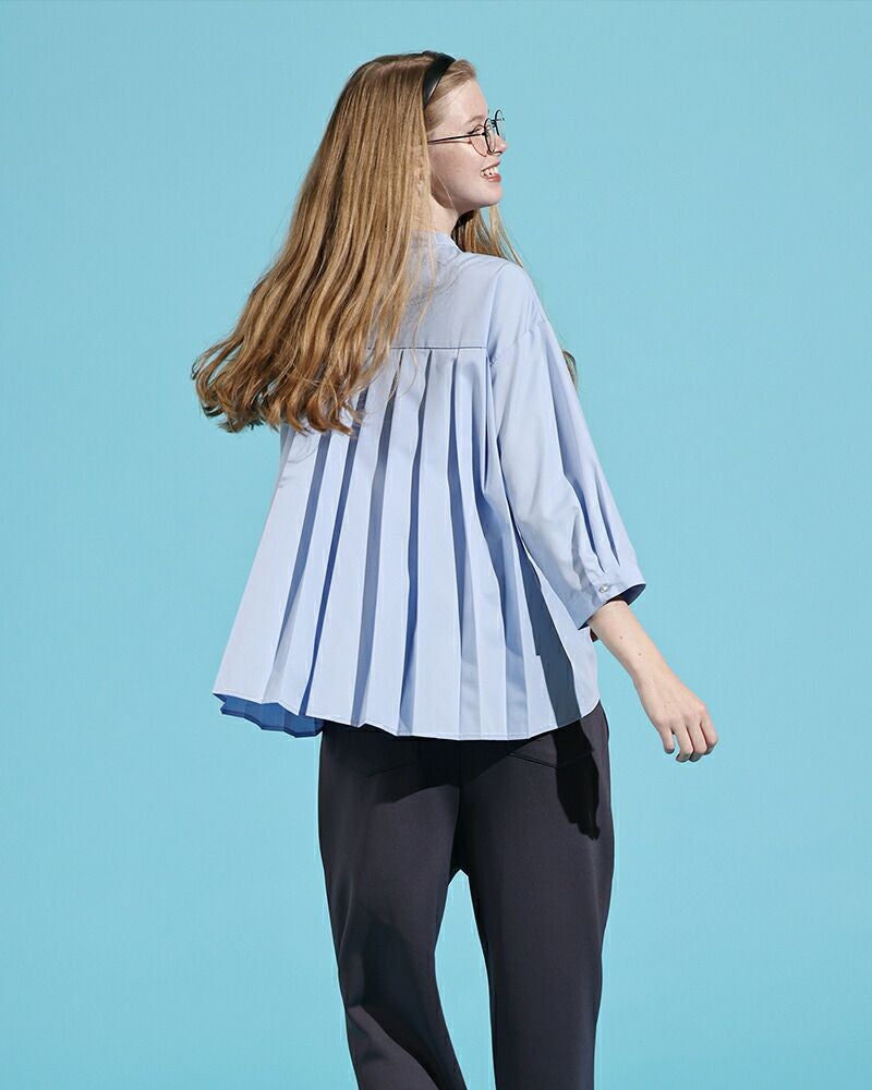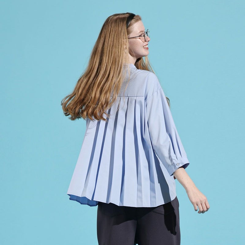 幅広のプリーツで背中のラインもすっきり。一枚で着てもしっかり主役になれるブラウスです。