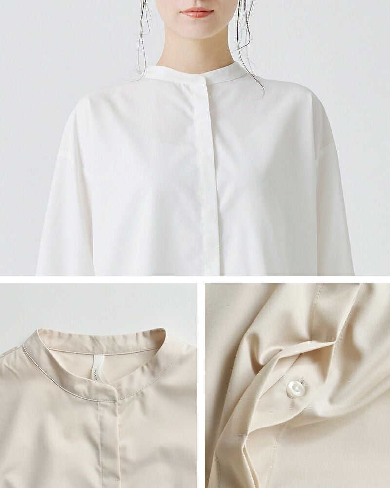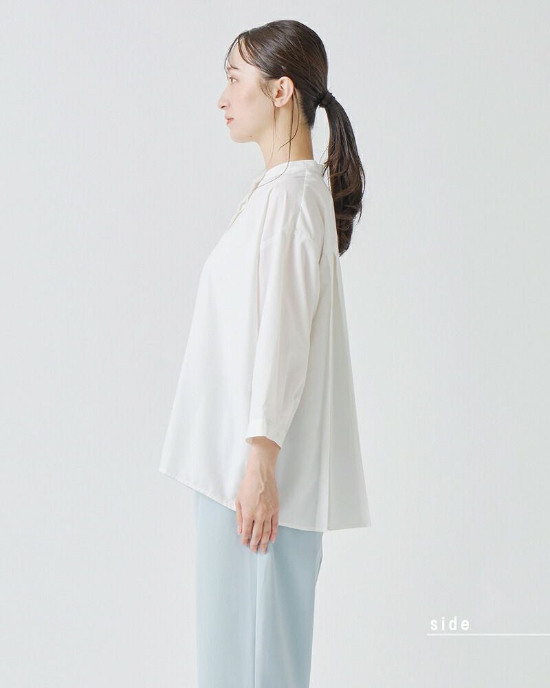 薄手で軽やかなタッチ感の生地は長時間の着用でもストレスフリー。控えめで落ち着いたツヤ感としなやかな落ち感で美しいブラウスのシルエットをひき立てます。