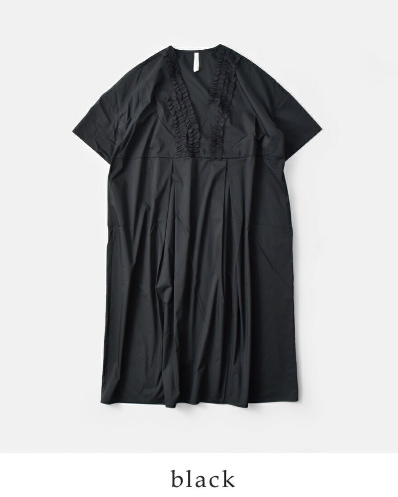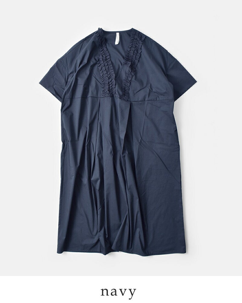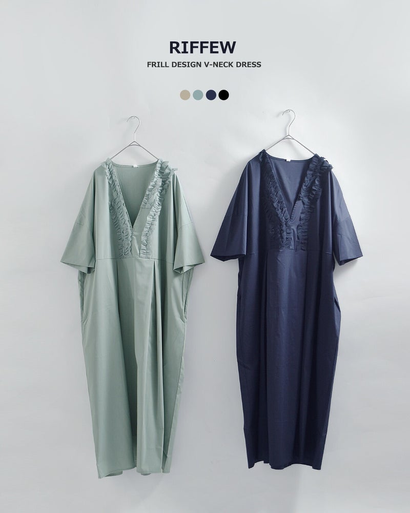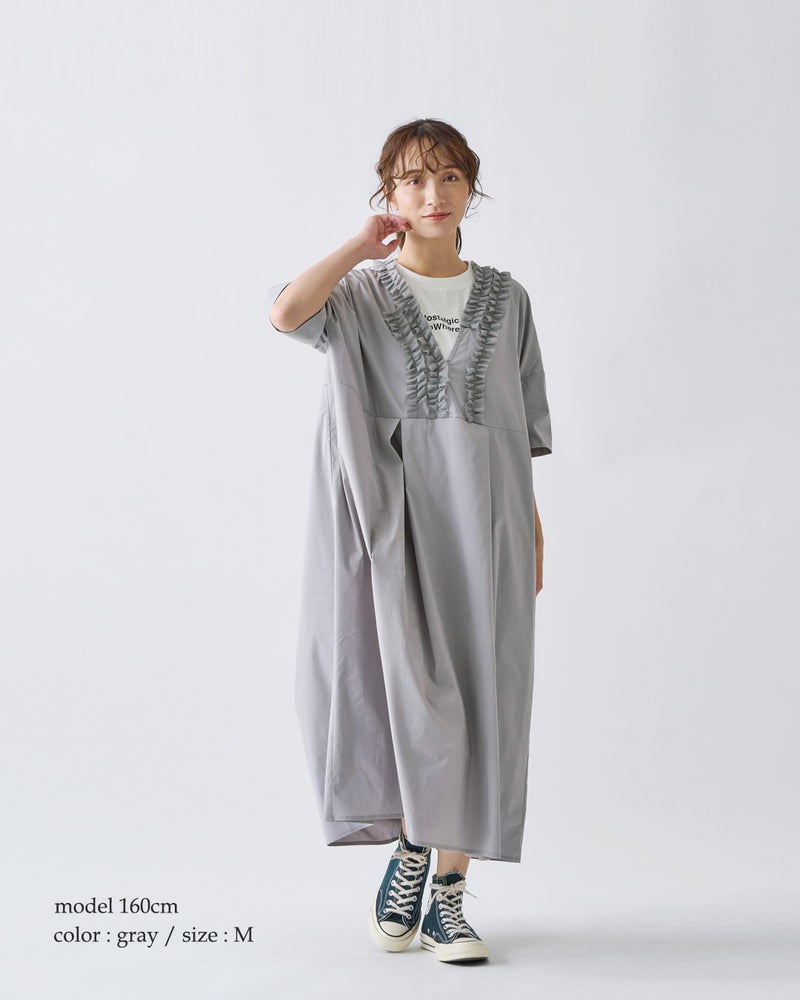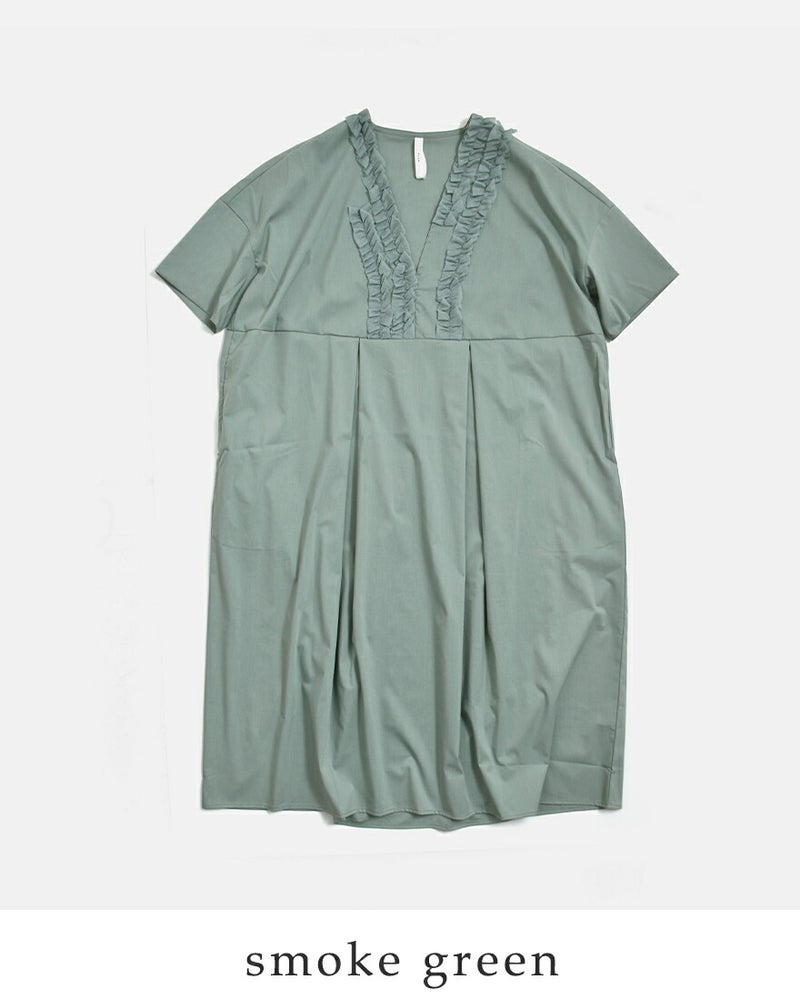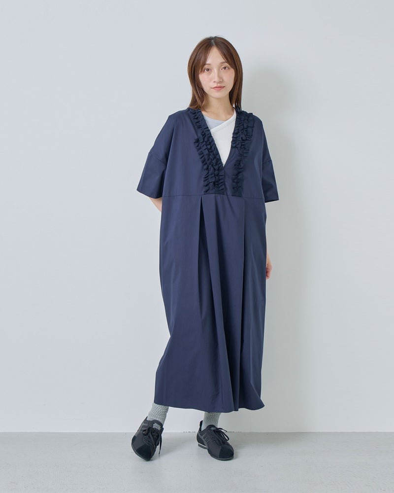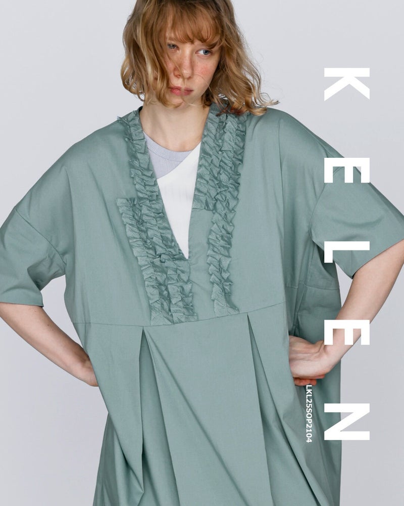 kelen(ケレン)より、フリルデザインVネックワンピース“RIFFEW”のご紹介です。首ぐりに沿って施したフリルがポイントのワンピースです。表地はシワになりにくいTC素材、フリルは程よく透け感のあるテンセル混素材を使用することで、軽やかさを演出しました。肘が隠れる袖丈で、ウエスト切り替えに大きなタックを施しているので、ヒップのシルエットを拾わず安心感のあるデザインです。Vネックでスッキリした印象なので、もちろんタンクトップも合いますし、プリントTなどを覗かせるのもカジュアルで可愛いスタイリングに仕上がります。