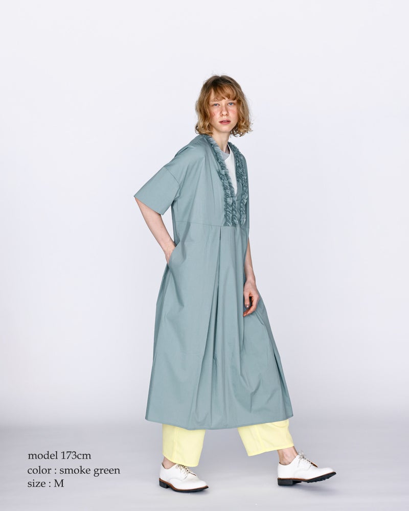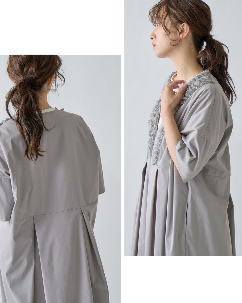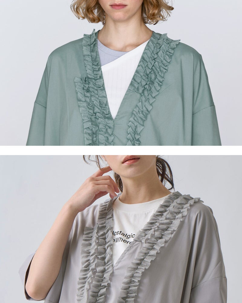 ■ポリエステル90%/綿10%表地は、軽やかでさらりとした肌触りの素材を使用し、シワになりにくく季節の変わり目からロングシーズン活躍。デイリー使いはもちろん、ちょっとしたお出かけにもぴったりな、大人の女性に寄り添う一着です。フリルは程よく透け感のあるテンセル混素材を使用することで、軽やかさを演出しました。