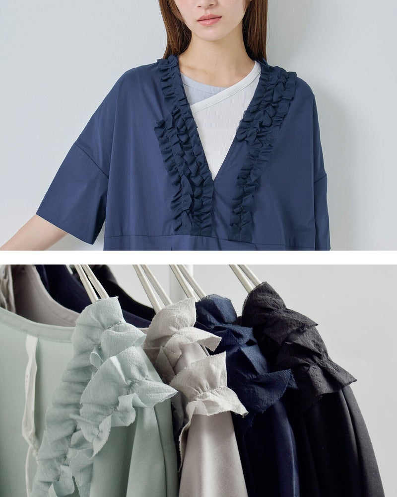 程よくゆとりを持たせたシルエットは、身体のラインを拾いすぎずリラックスした着心地。動くたびに揺れるフリルが、さりげなく華やかさをプラスしてくれます。※両サイドにポケット付き。